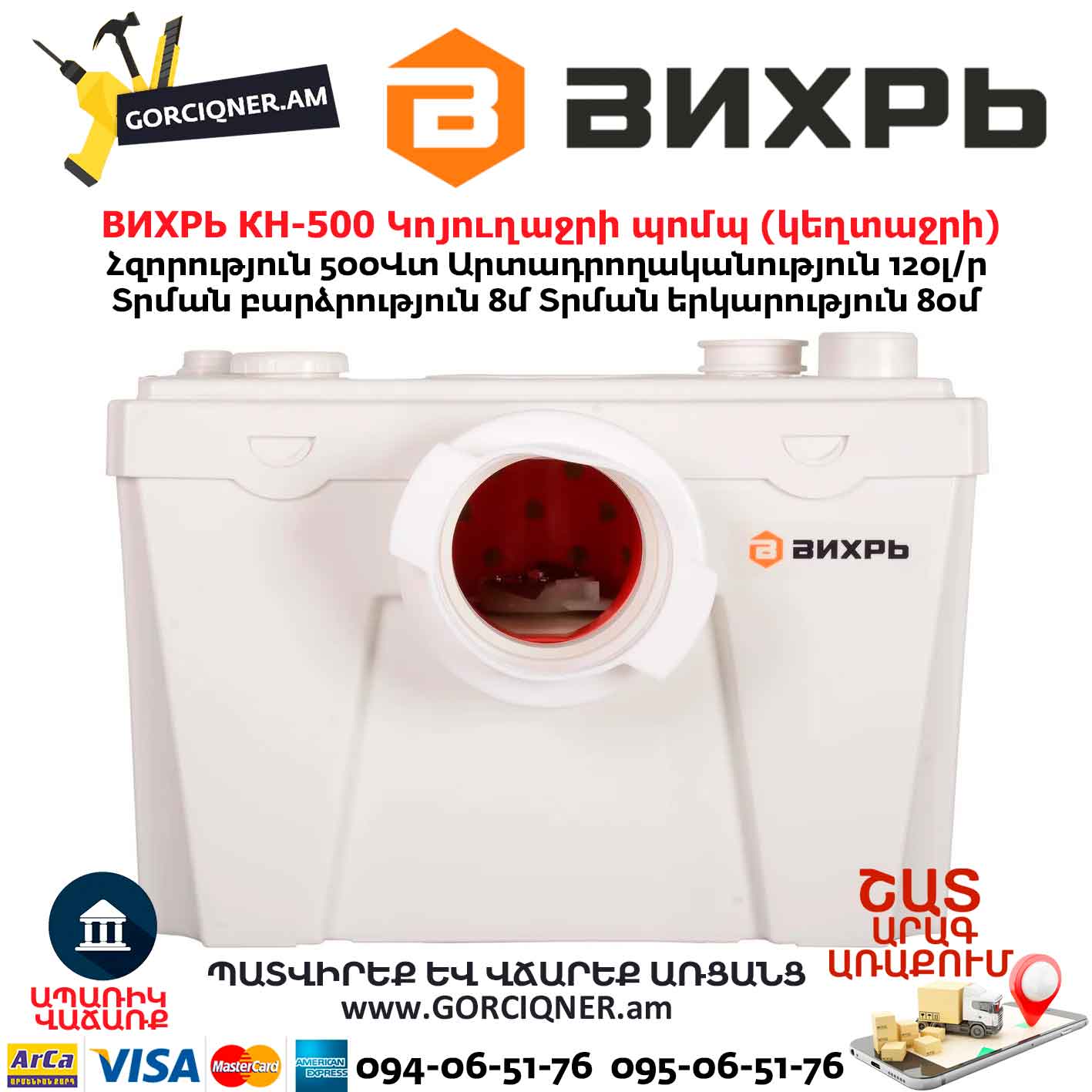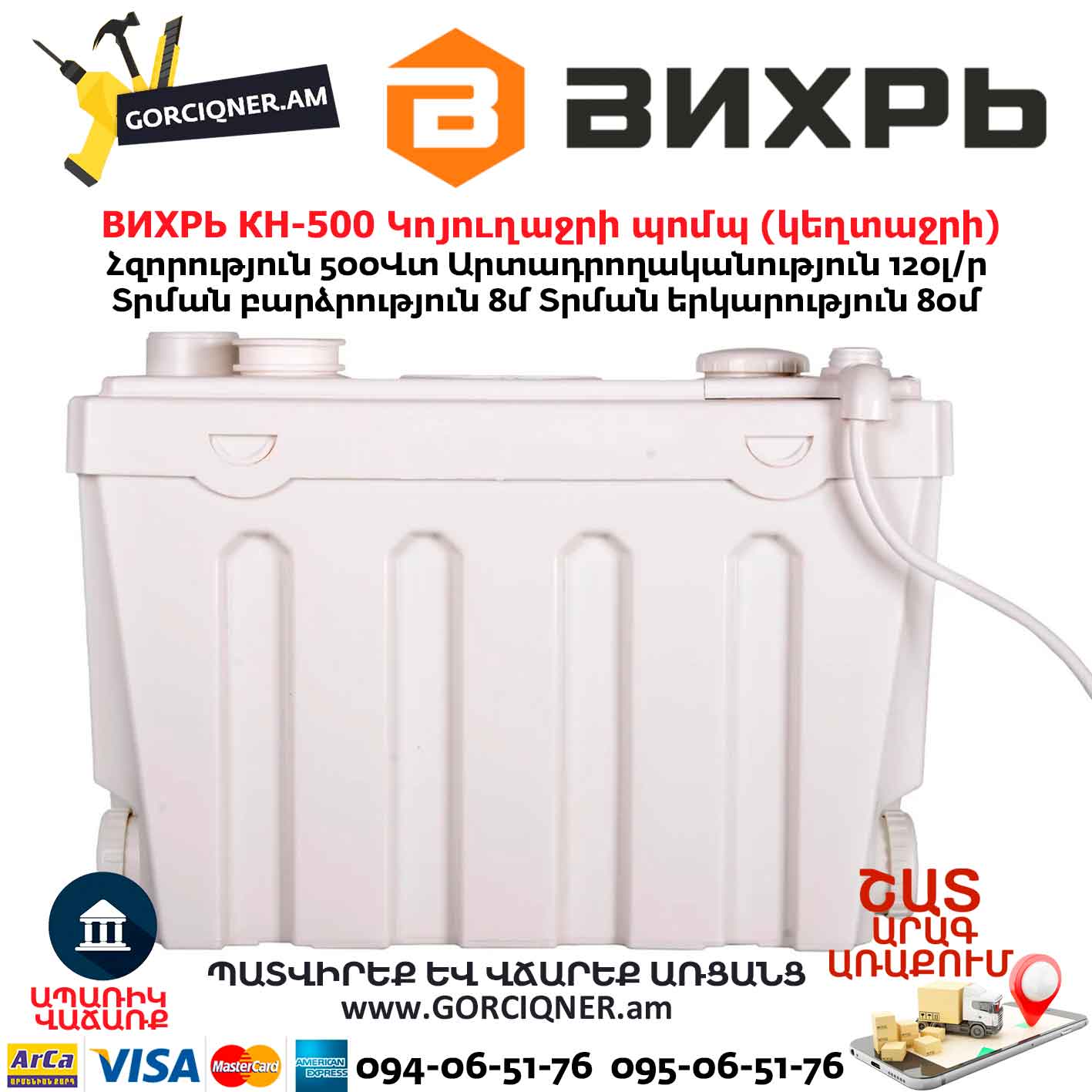 Удобная, компактная, эффективная модель Вихрь КН-500 будет полезна для подключения к канализации везде, где санузел расположен далеко от системы сточных труб или ниже ее.