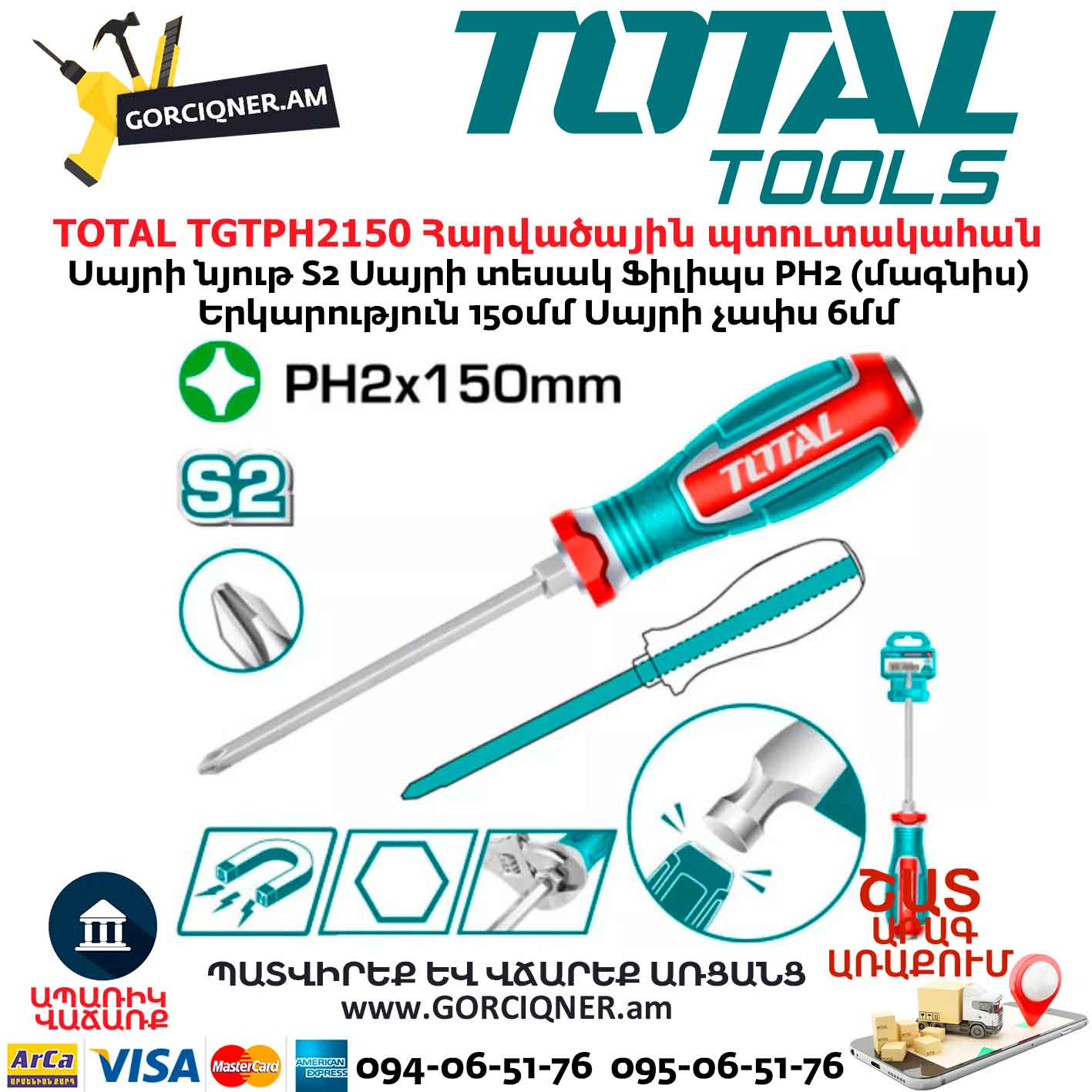 Крестовая ударная отвертка TOTAL TGTPH2150 PH2x150мм