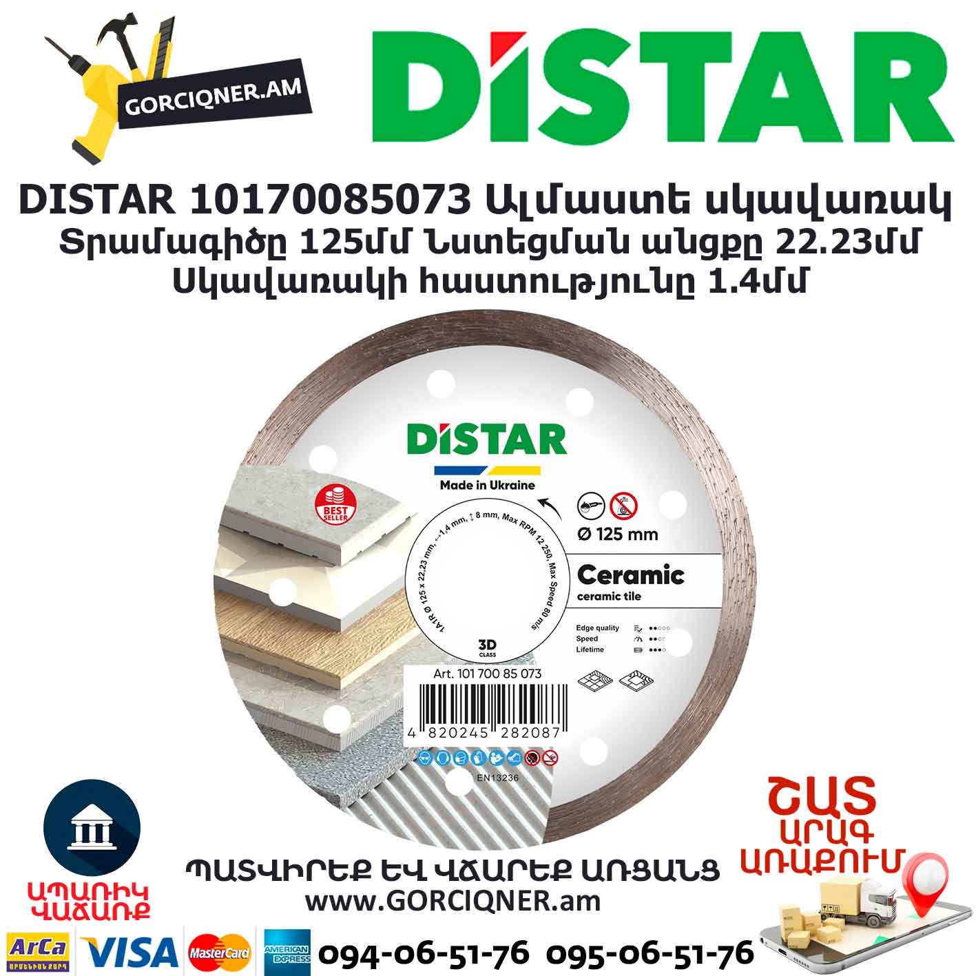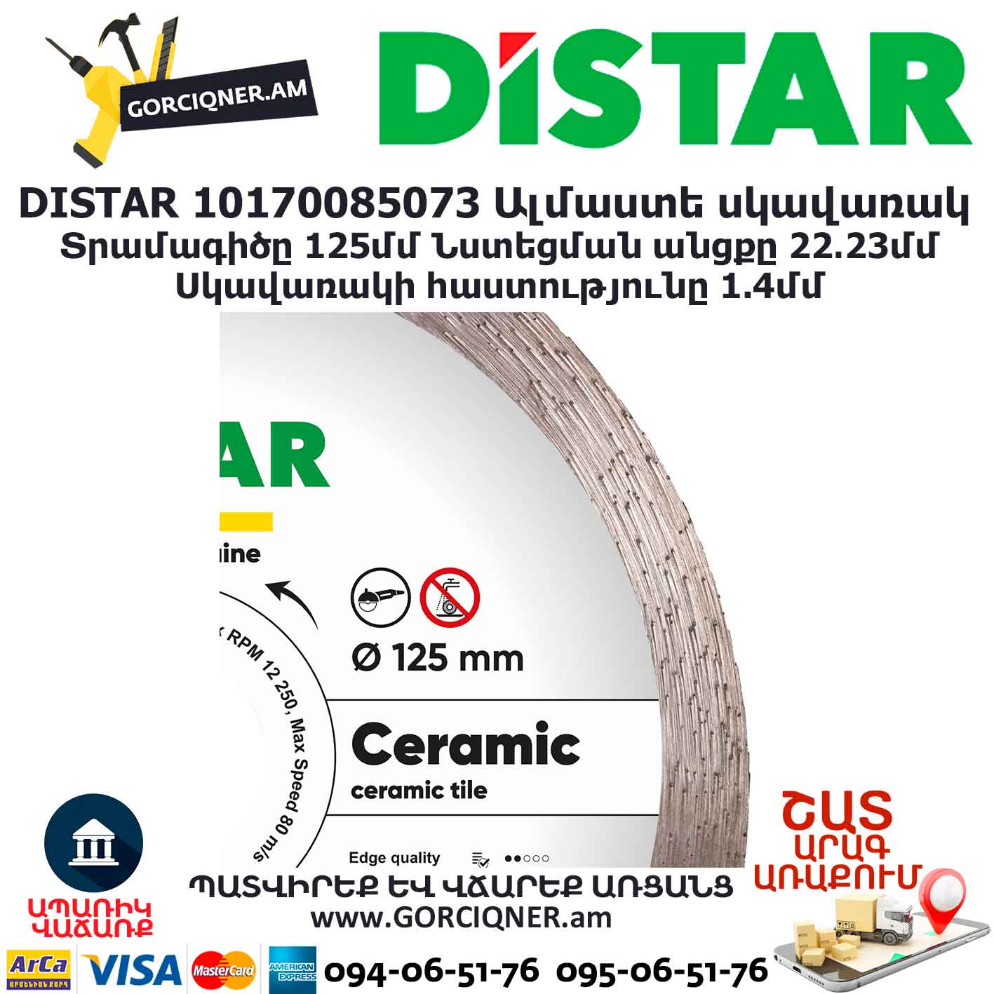 Алмазный отрезной круг 1A1R Ceramic – одно из лучших решений для работы с керамикой. Диск разработан специально для резки керамической плитки и керамогранита, но это не мешает работать им в широком спектре изделий, независимо от их типа. Поэтому, он станет отличным решением, как для домашнего использования, так и для профессиональных плиточников. При помощи круга 1A1R Ceramic можно проводить качественную и высокопроизводительную резку всех типов керамики. Также, стоит выделить его высокую скорость и достаточно большой ресурс работы. Данный диск предназначен для работы на углошлифовальных машинах и других станках-плиткорезах со стандартным посадочным валом 22,23мм,как с подачей водяного охлаждения, так и на сухую. Диск имеет наружный диаметр 125 мм высотой алмазного слоя 8 мм и толщиной 1,4 мм.
