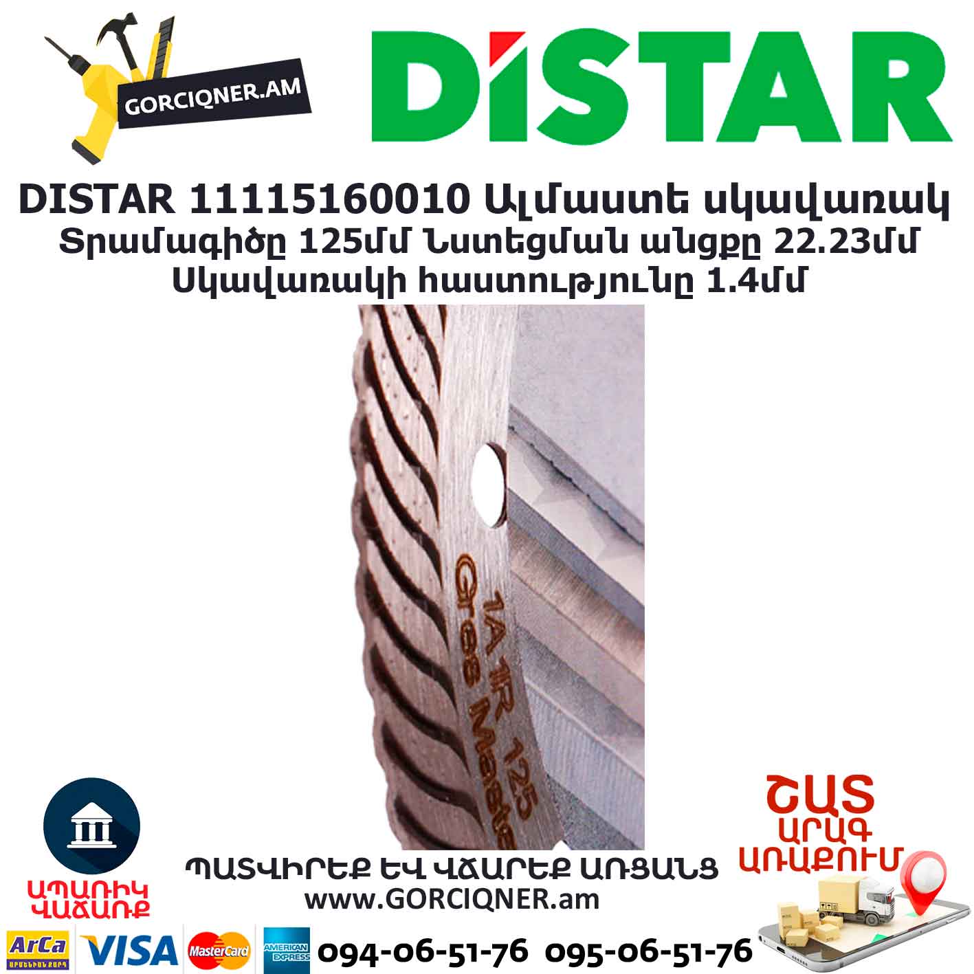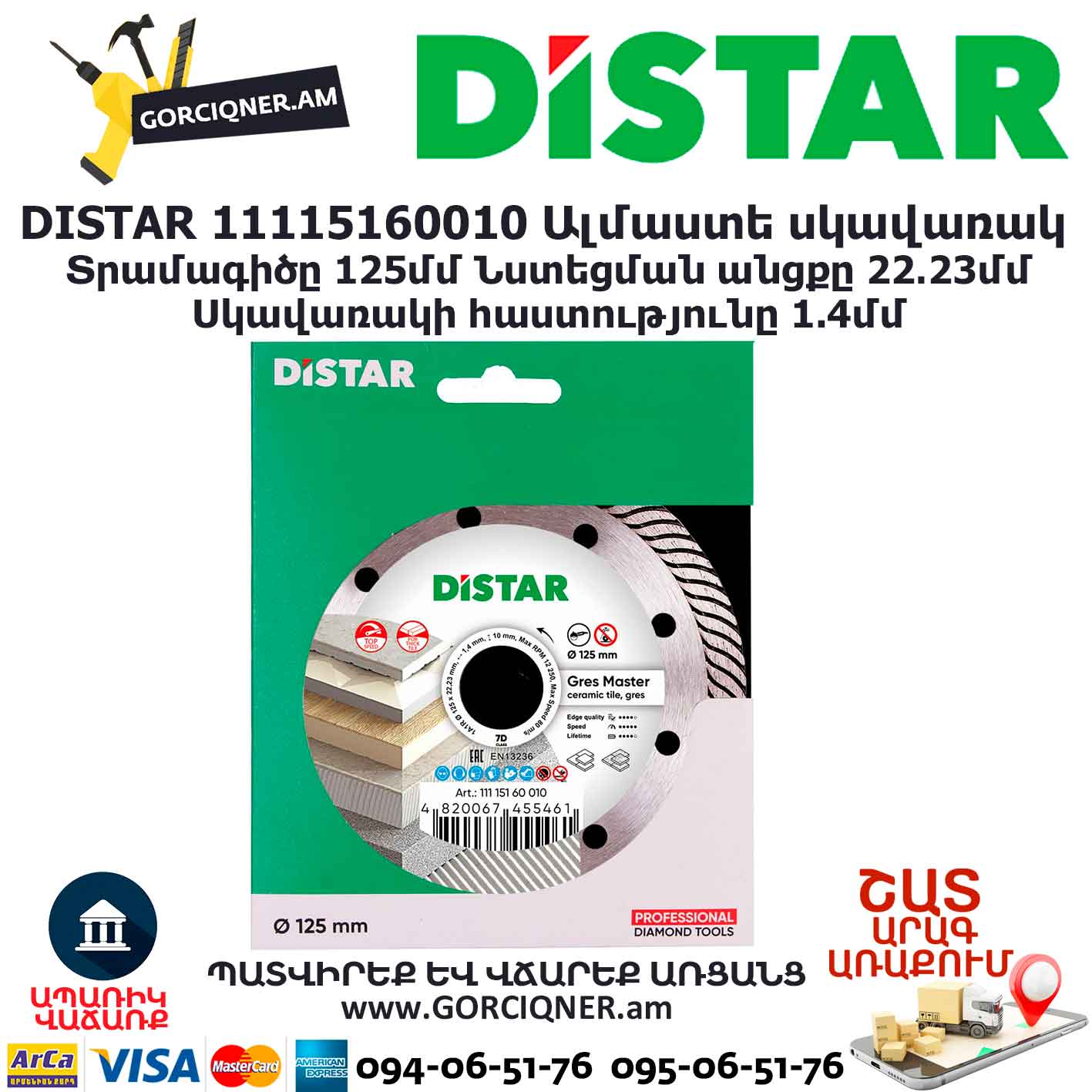 Быстрее не бывает. С каждым годом появляются все новые виды керамогранитной плитки с повышенной морозостойкостью, истираемостью. Все чаще используют керамогранит толщиной 14, 20 мм. Такие материалы очень трудно режутся обычными алмазными дисками. Происходит горение, деформация диска, остановка в резе. Диск Gres Master создан именно для таких сложных условий применения. Эвольвентные турбированные пазы алмазоносного слоя эффективно внедряются в прочный материал, охлаждая зону резания. Диск мягко утапливается даже в самый толстый керамогранит. Благодаря такой высокой производительности – это самый скоростной диск из всей линейки Distar. Диск также будет резать обычные керамограниты, но с очень высокой скоростью. Качество кромки уступает диску Esthete и Decor Slim, но очень часто такая чистота и не требуется, особенно там где стык плитки закрывается молдингом. Выпускается в диаметрах 115, 125 мм. Используется на УШМ без применения охлаждения.