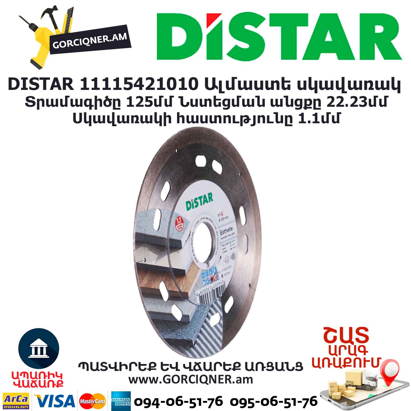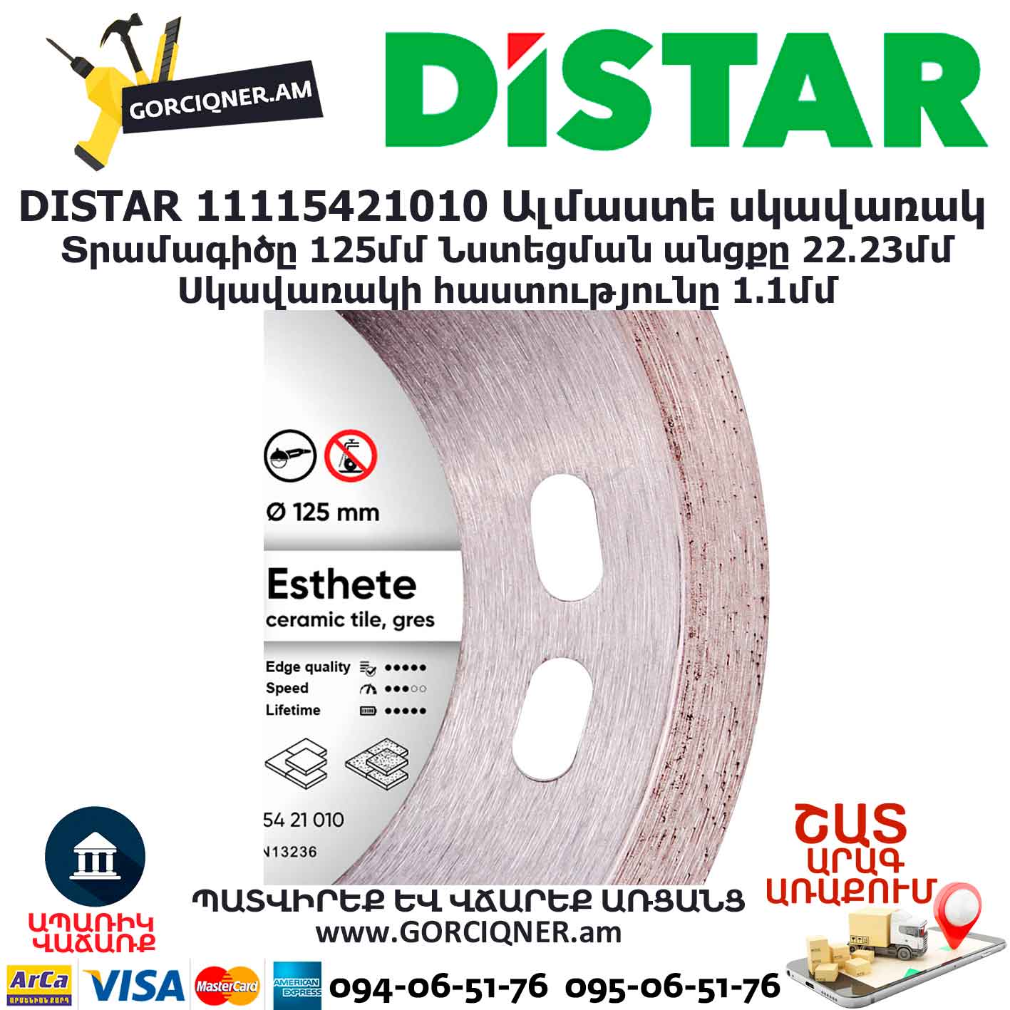Оснащен ультра-тонким алмазоносным слоем 1,1 миллиметр, что позволяет выполнять резку плитки даже с мягким глазурованным покрытием.