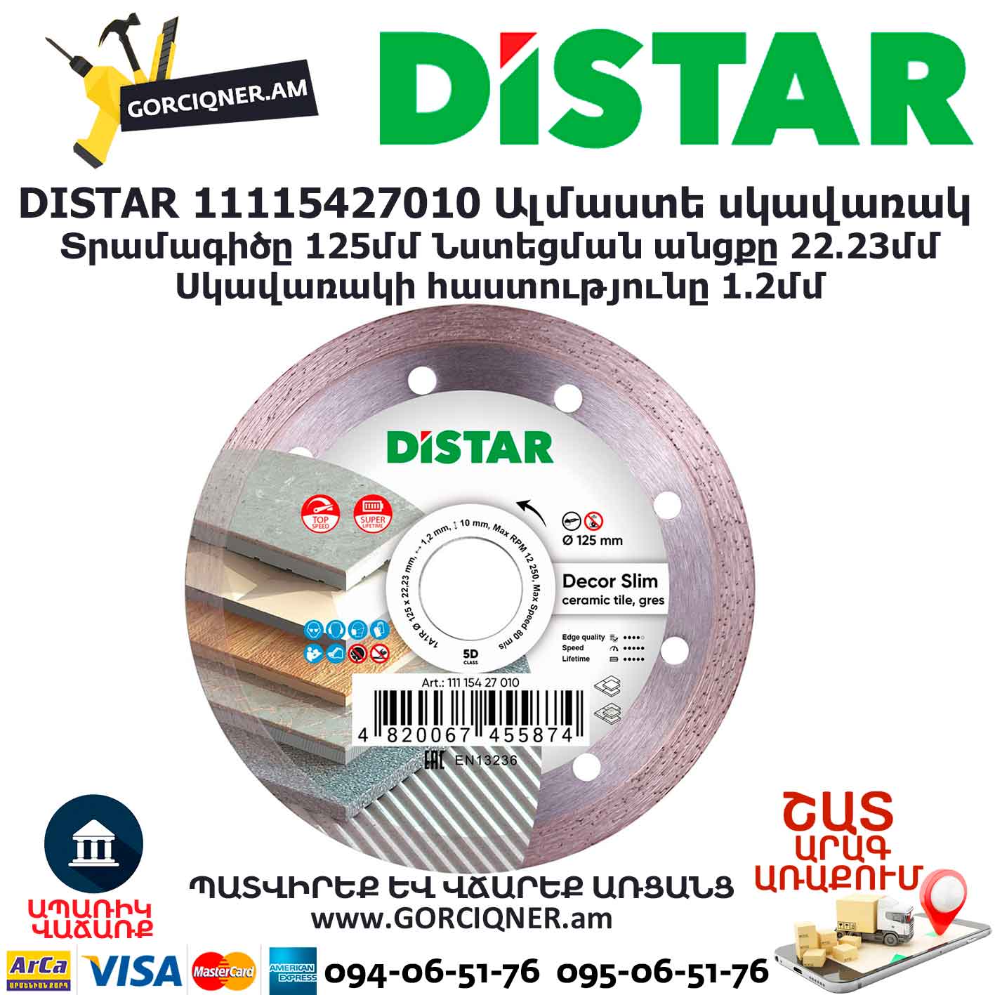 Алмазный диск DISTAR 1A1R DECOR SLIM 5D стал универсальным средством для резки плитки любого типа. После тестирования на различных покрытиях, он признан наиболее оптимальным для обработки керамогранита, напольной и настенной плитки. Диск имеет ультра-тонкий слой алмазной режущей кромки, всего 1,2 мм, что позволяет обеспечивать максимально тонкий и чистый рез. При тестировании на керамограните толщиной 10 мм, диск показал высокую скорость работы в 1,75 погонных метра в минуту, при этом сохранив высокое качество кромки, оцененное в 4 балла из 5. На рынке представлен в двух вариантах, диаметром 115 и 125 миллиметров, со стандартным посадочным отверстием 22,23.