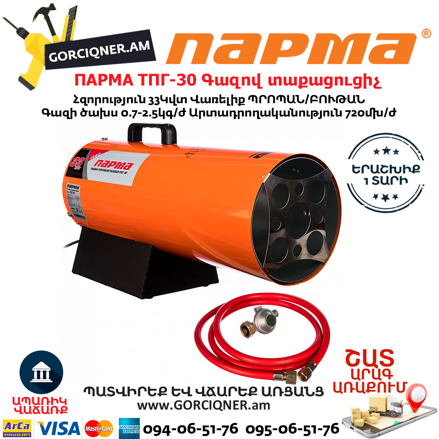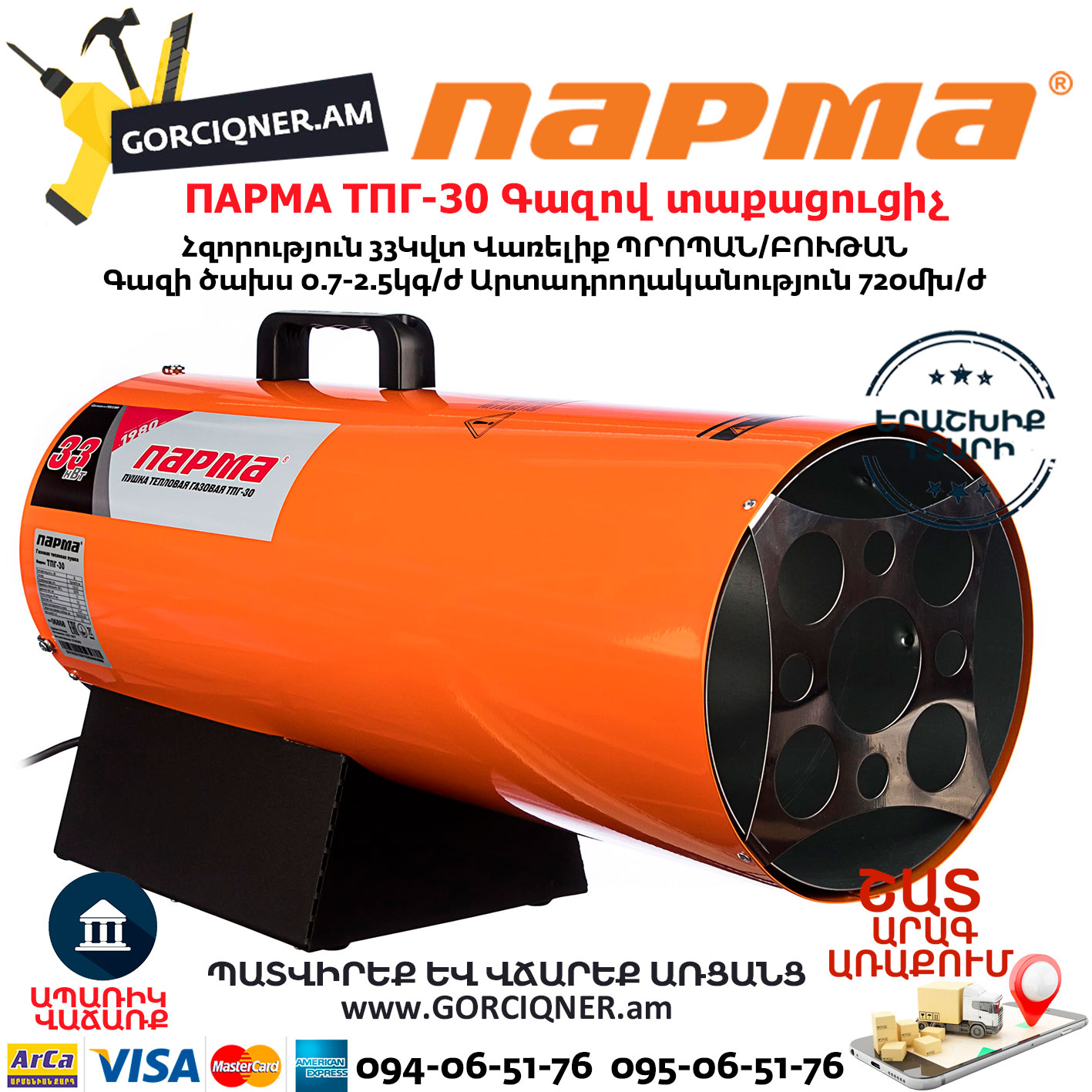 Газовая пушка Парма ТПГ-30 – воздухонагреватель прямого нагрева, работающий на газовом топливе. Топливо необходимо для получения горячей атмосферы в камере сгорания, а электроэнергия, подводимая к устройству, необходима для питания вентилятора, нагнетающего воздух, и для функционирования автоматики. Газовая пушка является простой и надежной конструкцией без дымохода, но горячий воздух и продукты сгорания из устройства поступают в помещение.