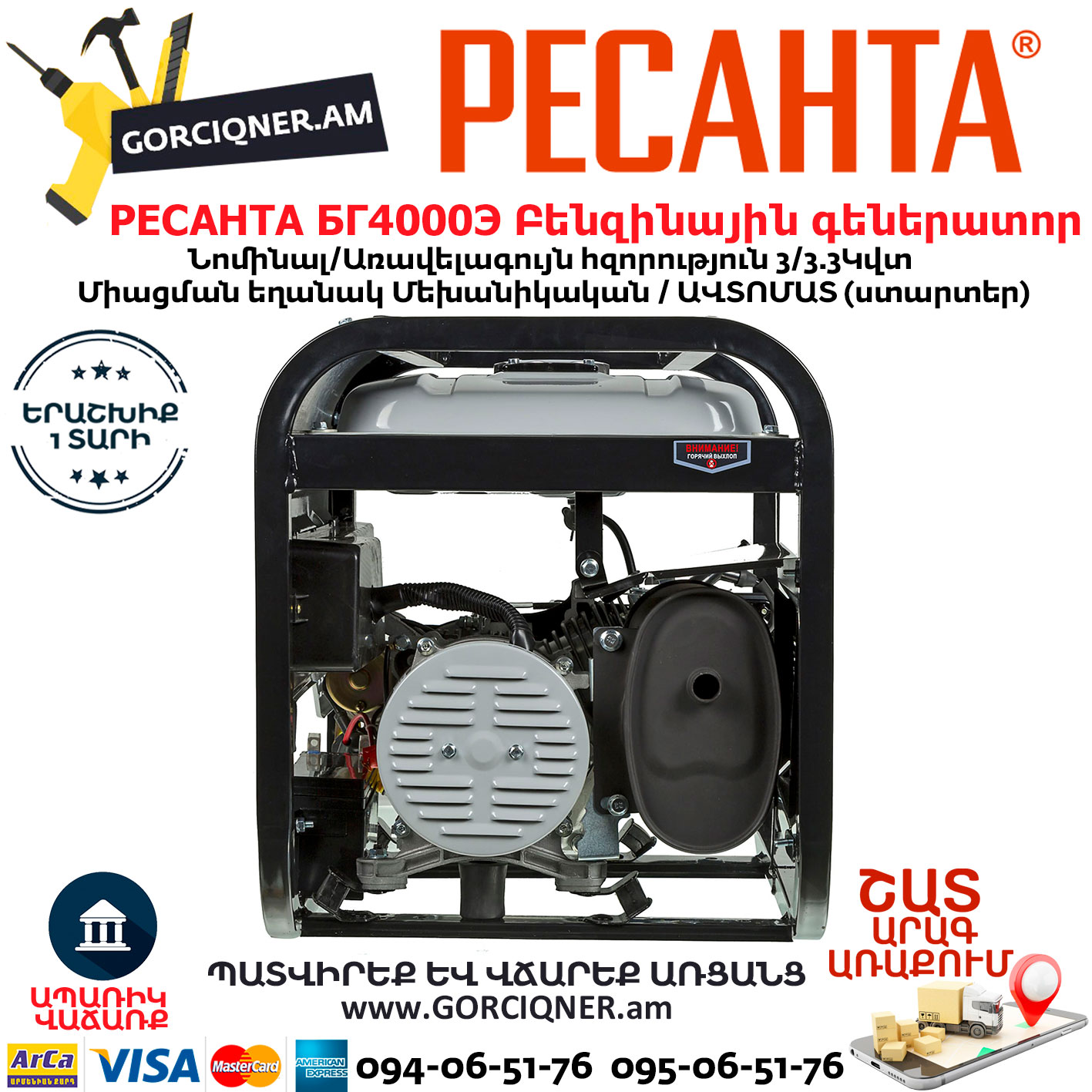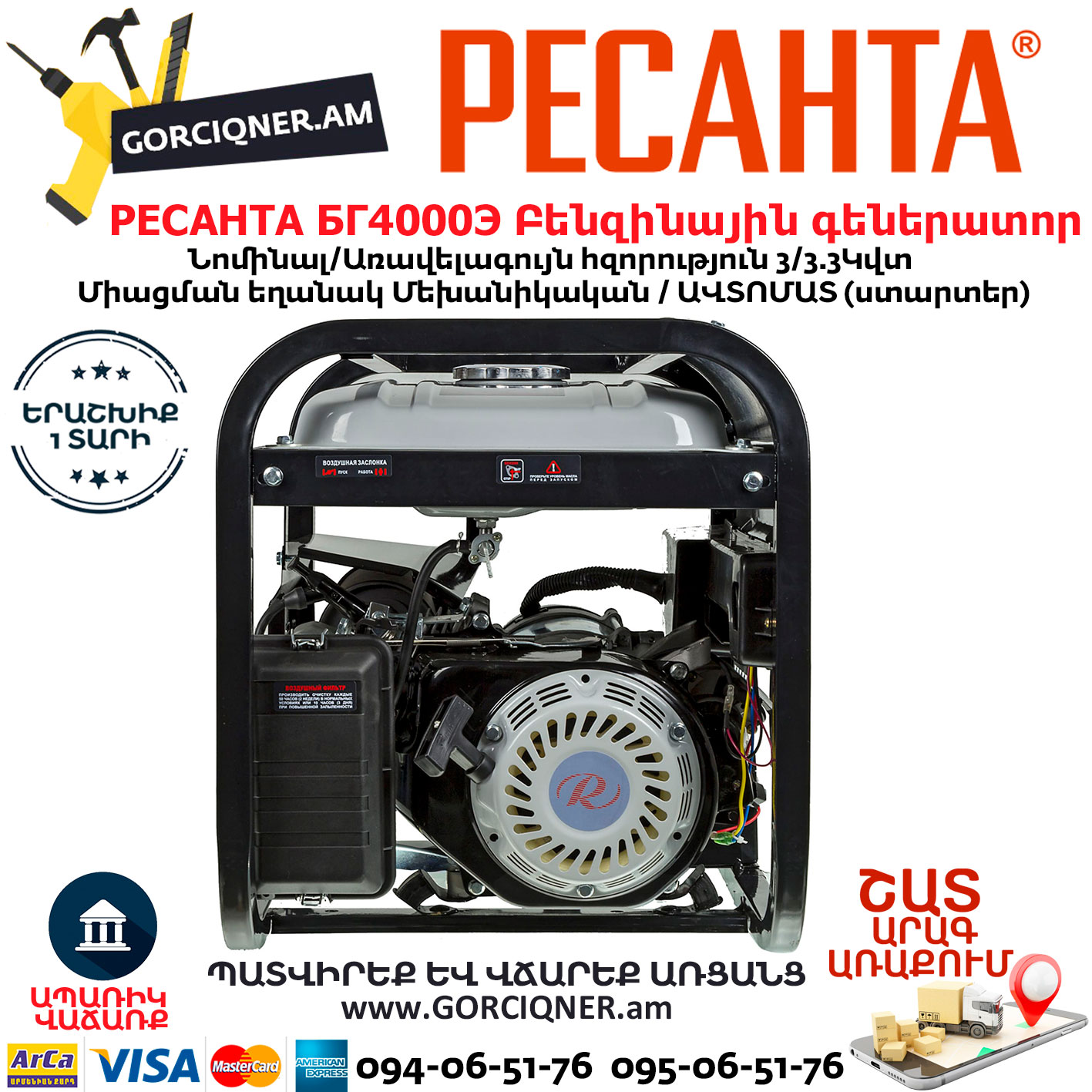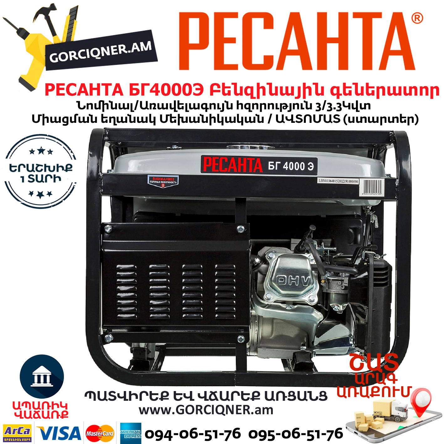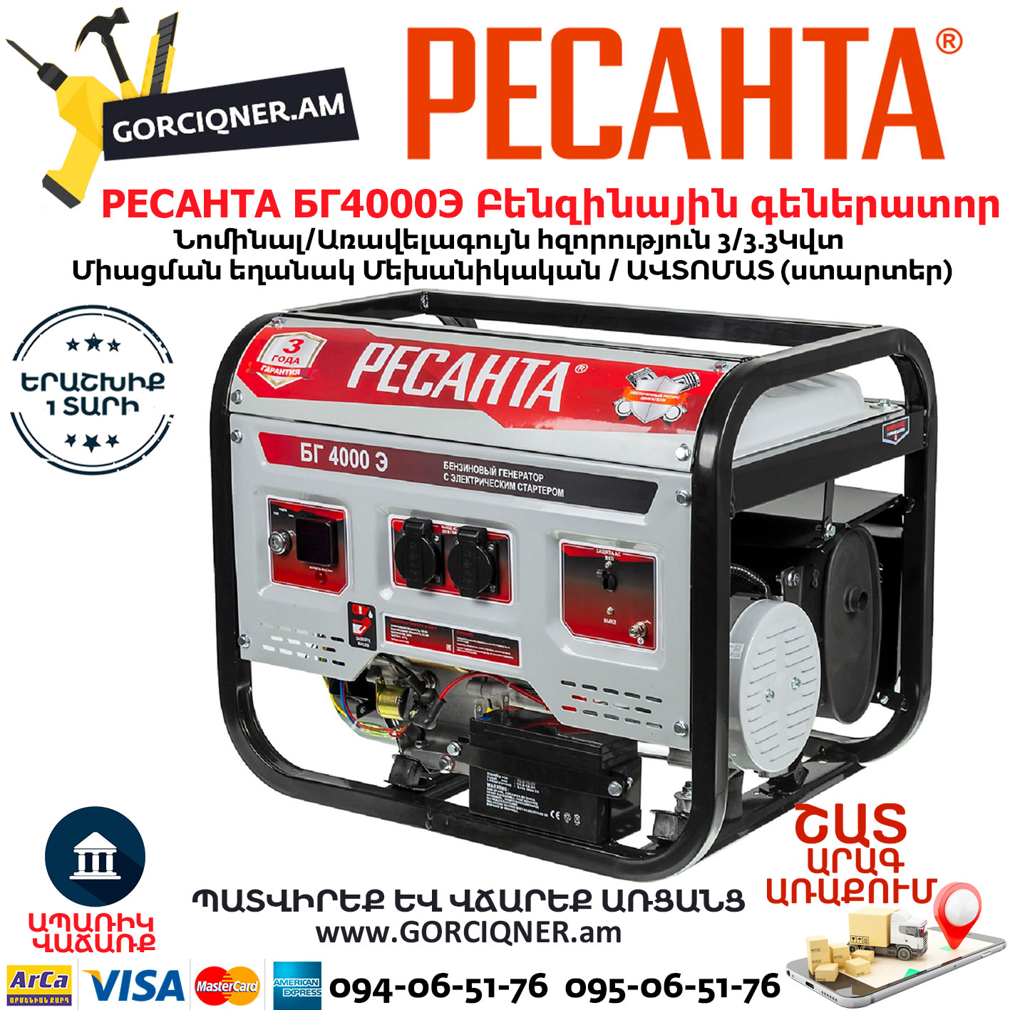 Электрогенератор (бензогенератор) – электрическая машина, предназначенная для автономного электроснабжения. В качестве первичного двигателя используется четырёхтактный карбюраторный двигатель, топливом для которого является неэтилированный бензин. Электрогенератор предназначен для получения электроэнергии в тех местах, где отсутствует магистральное электроснабжение. Это касается, как частных домов, где генераторы могут использоваться в качестве резервного источника питания, так и различных участков работ, где нужно электропитание для оборудования и проведения работ. Электрогенераторы РЕСАНТА обладают повышенным ресурсом и имеют гарантию 3 года. Генераторы отличаются высоким качеством, надёжностью и оснащённостью.