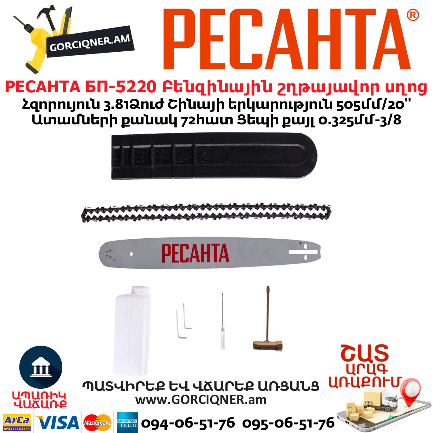 В бензопиле Ресанта БП-5220 установлен мощный двухтактный бензиновый мотор на 3,8 л.с.. Для заправки используется смесь бензина с моторным маслом 2Т. Пропорции смотрите на упаковке масла.