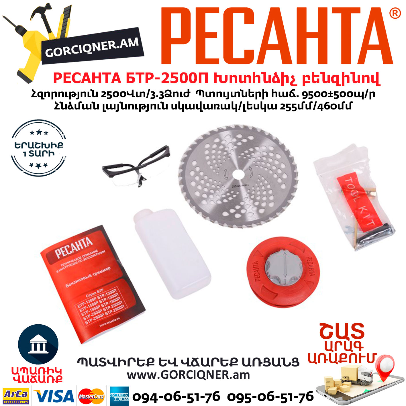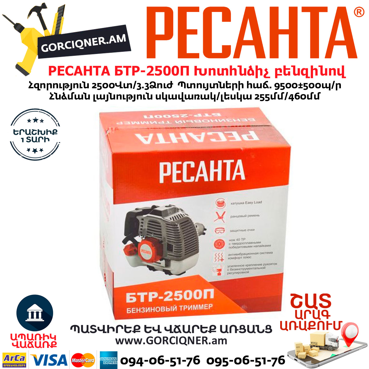 Триммер Ресанта БТР-2500П относится к линейке садовой техники средней мощности, и предназначен для скашивания сорных трав, кустарников и молодых ростков деревьев. Данная модель бензотриммера оснащена двухтактным ДВС с ручным запуском. Двигатель имеет мощность 2500 Вт, развивает до 9,5 тыс. об./мин и позволяет обрабатывать триммером участки большой площади в режиме длительной, непрерывной работы. Работает двигатель на смеси высокооктанового бензина, не ниже 92, и масла для 2-х тактных двигателей. Для приготовления топливной смеси производитель рекомендует использовать фирменное полусинтетическое моторное масло для двухтактных двигателей «HUTER 2T». Система охлаждения ДВС – воздушная.