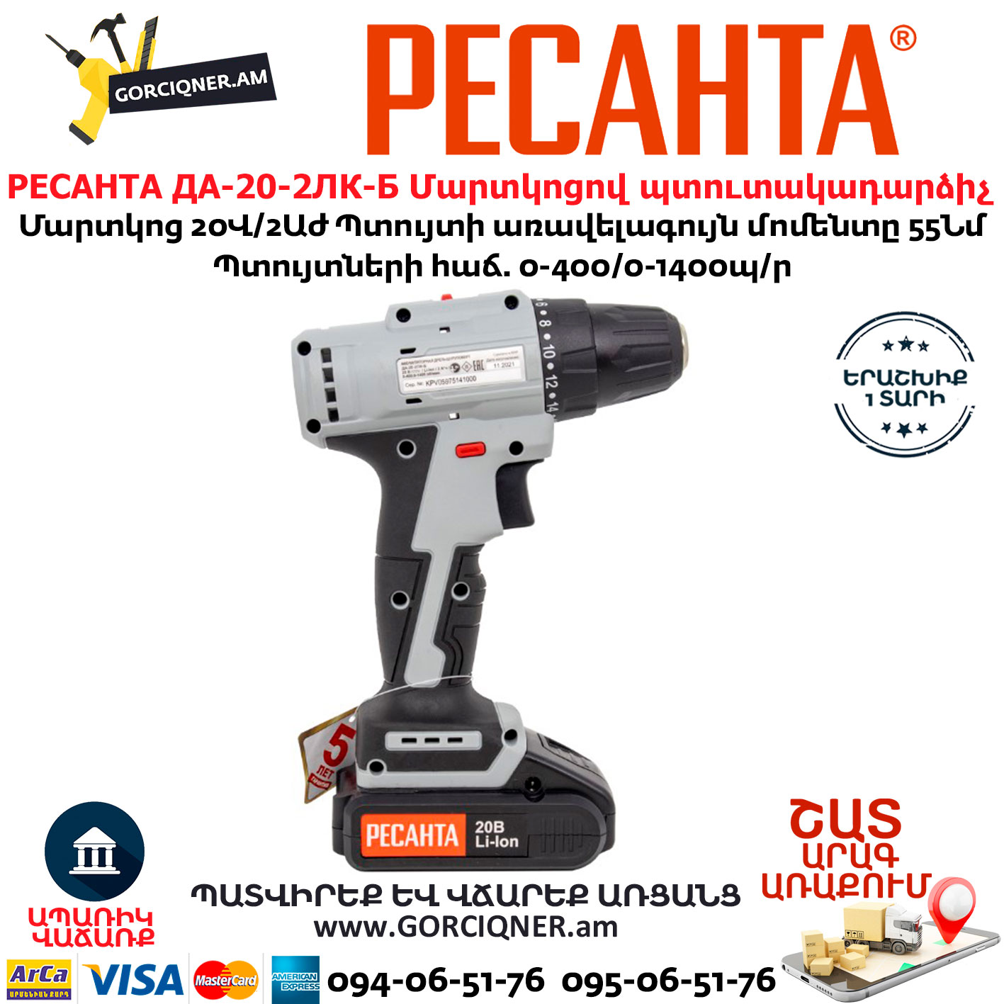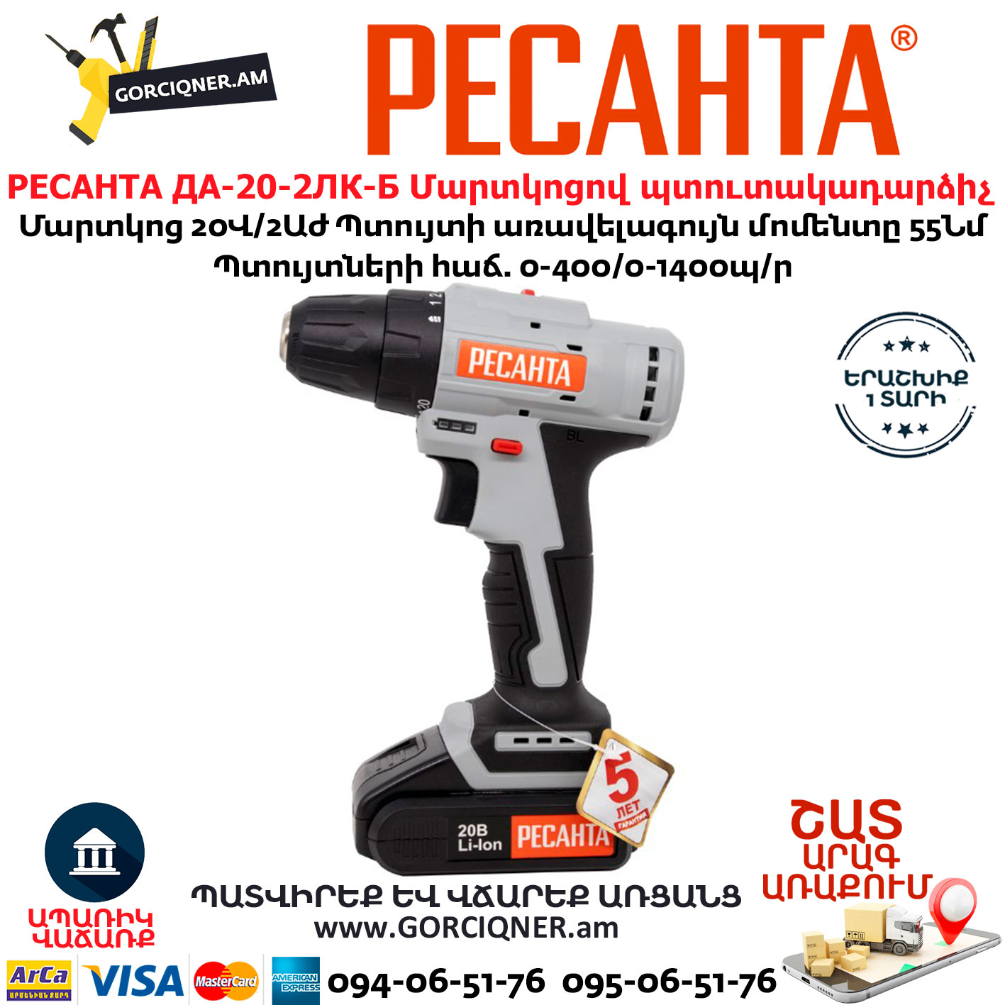 РЕСАНТА ДА-20-2ЛК-Б Дрель-шуруповерт аккумуляторная 20В/2А*ч (бесщеточный двигатель)