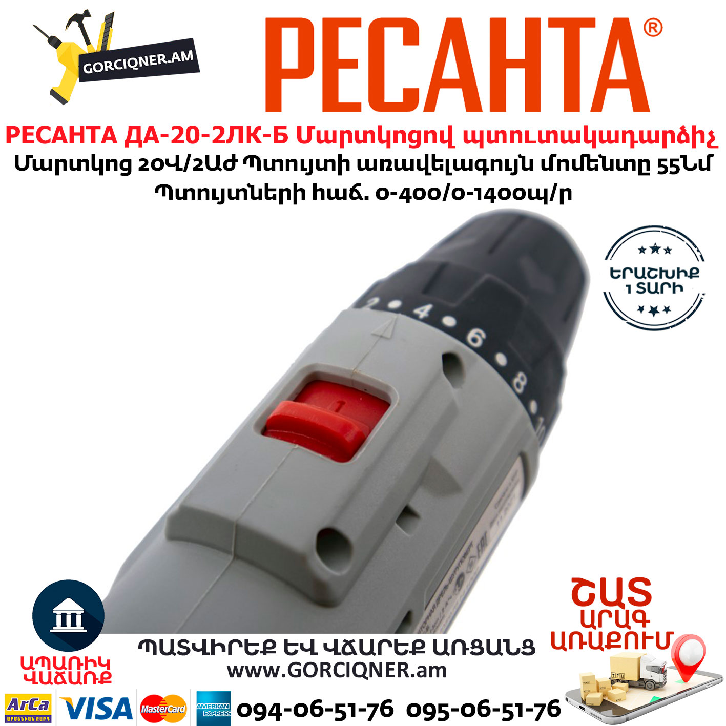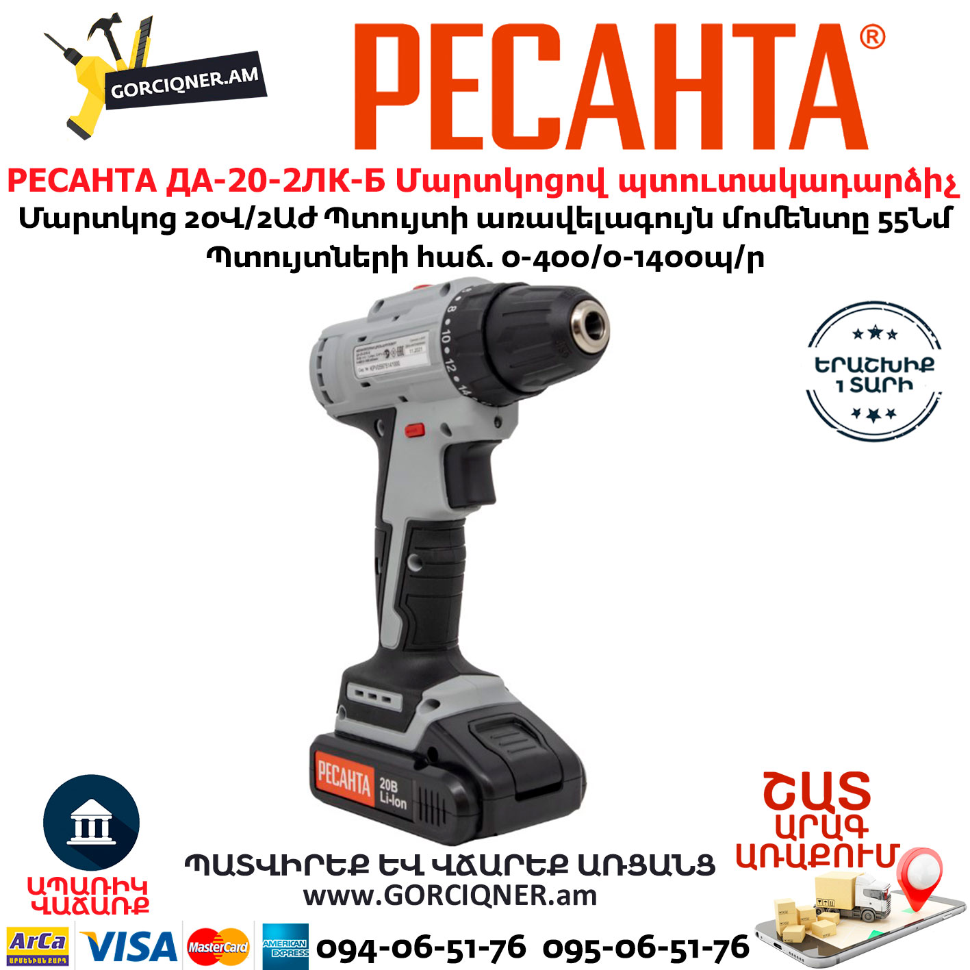 Дрель-шуруповерт аккумуляторная ДА-20-2ЛК-Б (2,0 А/ч) (бесщеточный двигатель) Ресанта используется для просверливания отверстий в деревянных, пластмассовых и металлических изделиях или для работы в качестве шуруповерта. Модель оснащена 2 аккумуляторами и кейсом, незаменима для людей, постоянно использующих дрели-шуруповерты в быту.