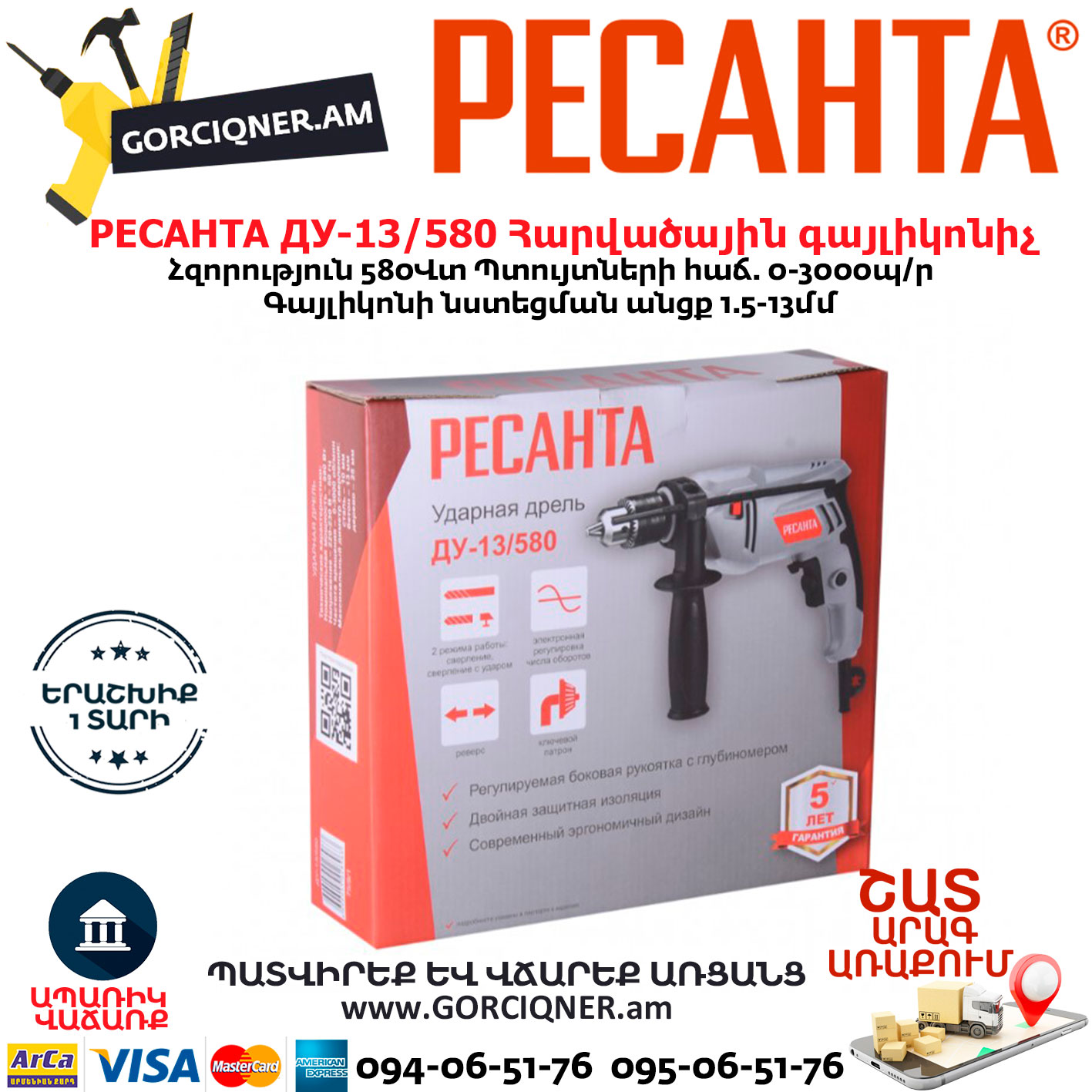 РЕСАНТА ДУ-13/580 Дрель ударная 580Вт