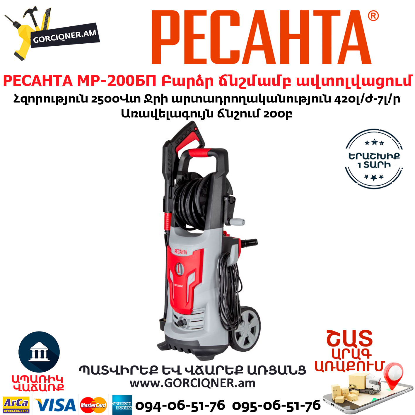Мини-мойка Ресанта МР-200БП сделана на основе синхронного двигателя с мощностью 2500 ВТ. Мойка поддерживает рабочее давление в 13 МПа, максимальное давление – 20 МПа. Расход воды – 420 литров в час. Высокие показатели давления и расхода воды позволяют смывать загрязнения в кратчайшие сроки. Воду можно забирать не только с водопроводов, но и с емкостей. Есть фильтр для грубой очистки поступающей воды.