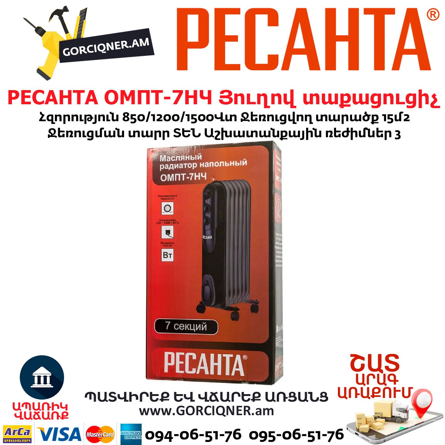 РЕСАНТА ОМПТ-7НЧ Масляный радиатор 850/1200/1500Вт