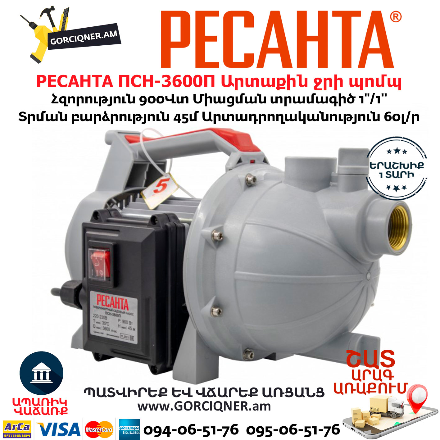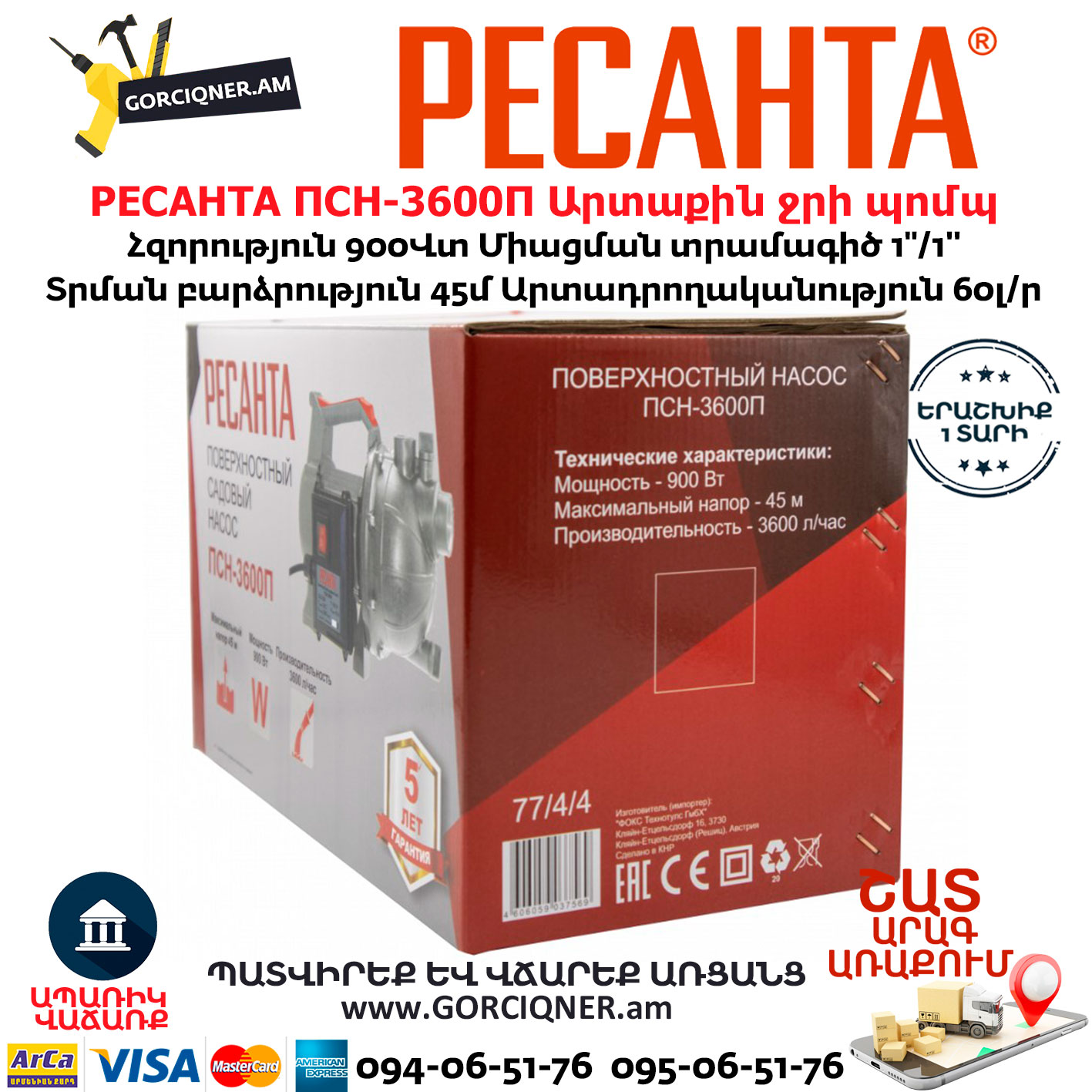 РЕСАНТА ПСН-3600П Поверхностный насос 1”/900Вт
