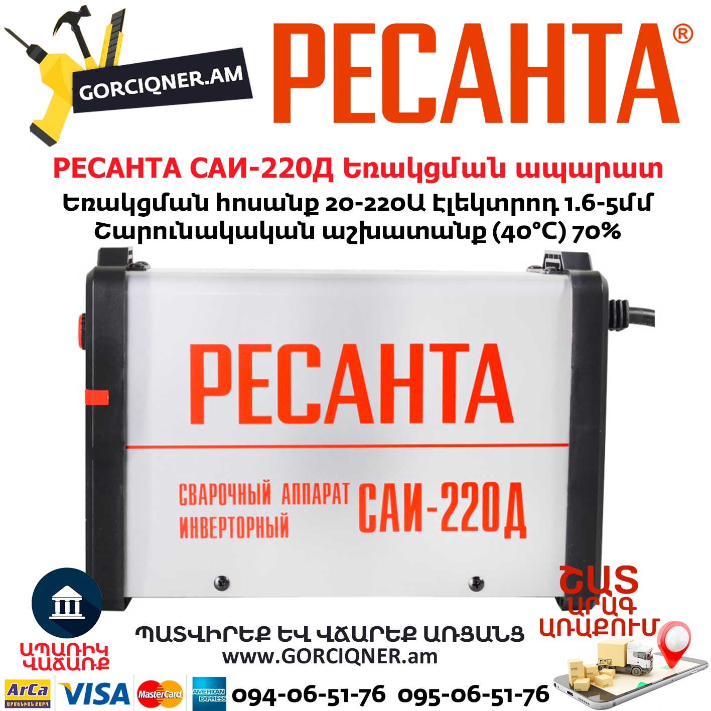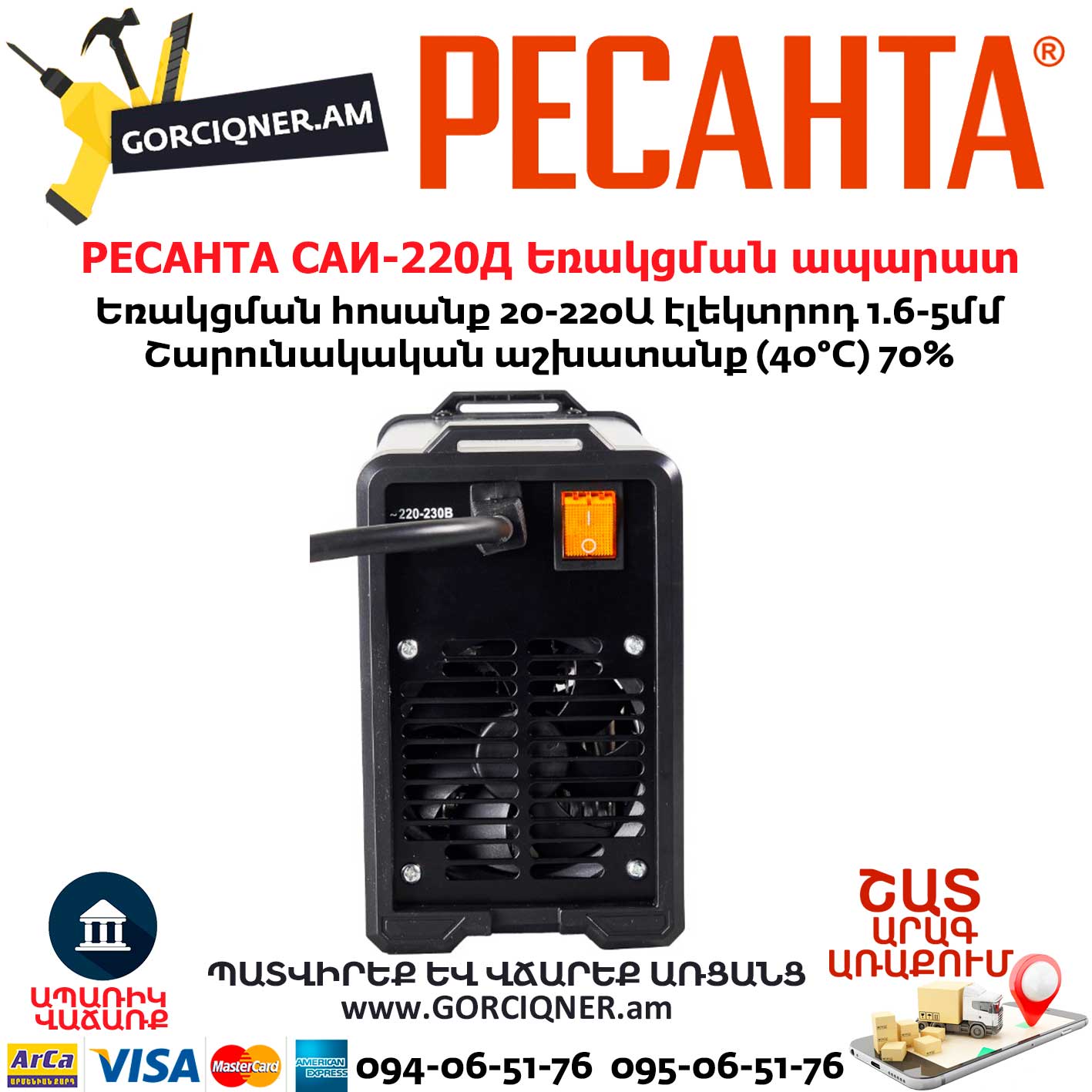 Сварочный аппарат инверторный (далее – САИ) «Ресанта» предназначен для ручной дуговой сварки штучным покрытым электродом на постоянном токе и электродом с рутиловым и основным покрытием (режим ММА), наплавки, а также сварки постоянным током неплавящимся электродом в среде защитного газа углеродистых и нержавеющих сталей (режим TIG LIFT). Сварка осуществляется постоянным током в среде аргона.