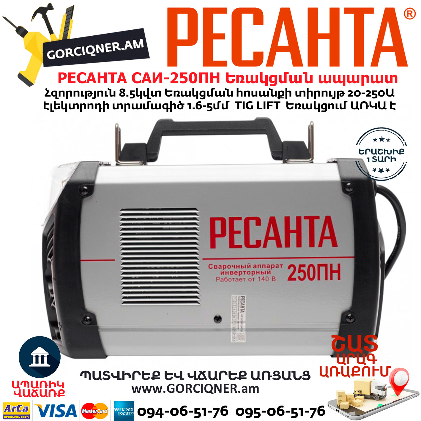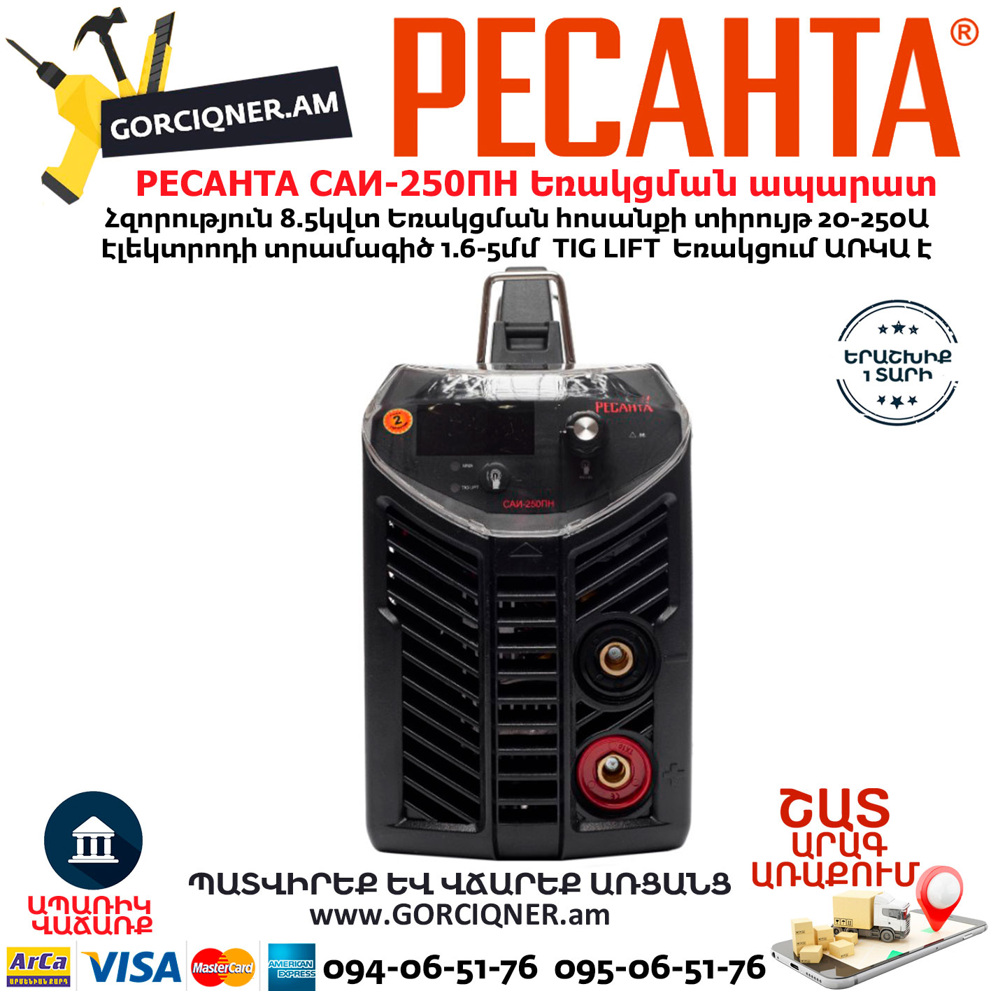 Сварочный аппарат сери САИ-250 ПН «Ресанта» предназначен для ручной дуговой сварки штучным покрытым электродом на постоянном токе и электродом с рутиловым и основным покрытием (режим ММА) и сварки постоянным током неплавящимся электродом в среде защитного газа углеродистых и нержавеющих сталей (режим TIG LIFT). Сварка осуществляется постоянным током в среде аргона.