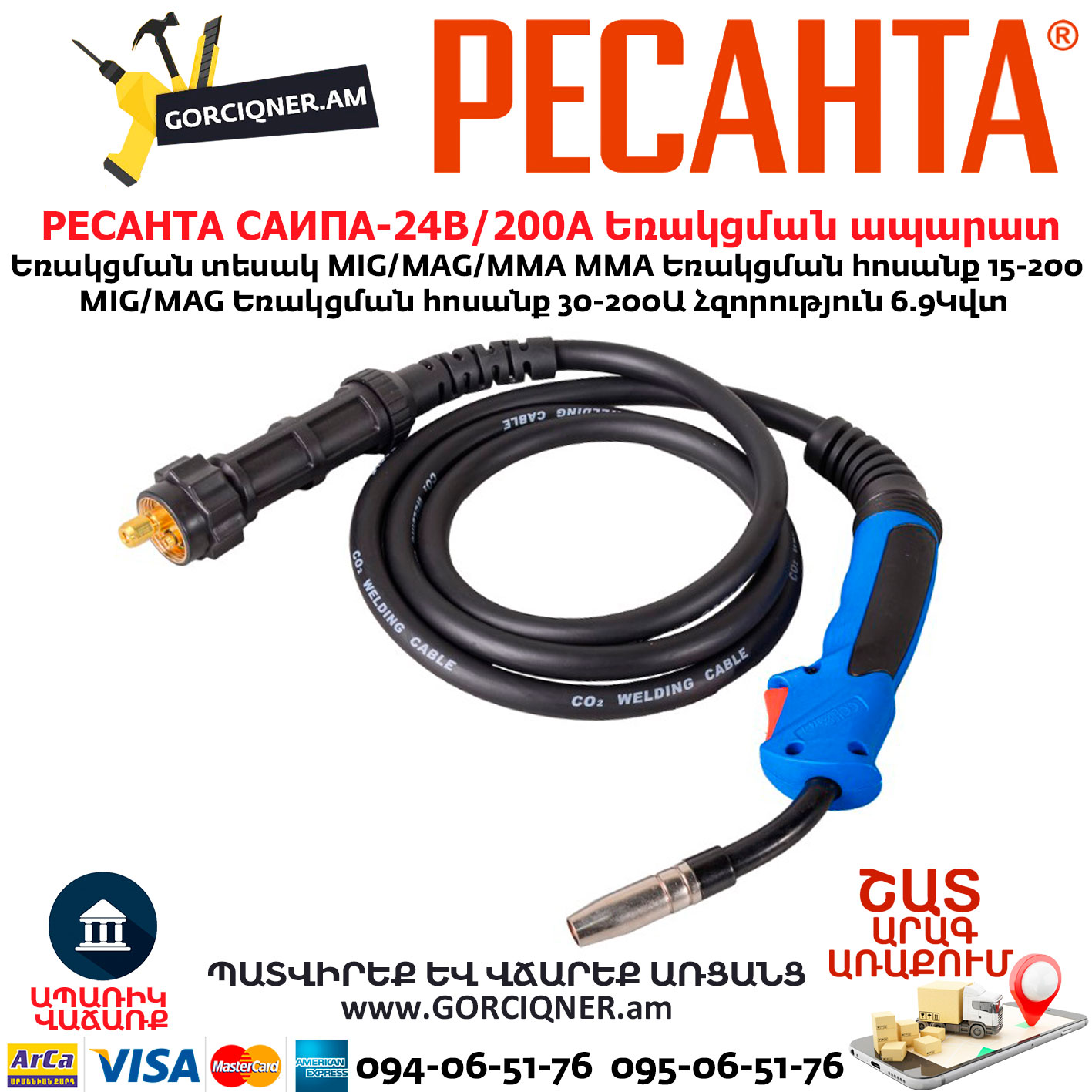 Сварочный аппарат изготовлен по новой IGBT-технологии, которая обеспечивает стабильную работу независимо от скачков входного напряжения, минимальное разбрызгивание металла при сварке и сравнительно низкое потребление энергии. Напряжение питающей сети 230±10% В. Рабочее напряжение 140 – 260 В. Сварочный ток – 30-200 А. Аппарат может работать с электродной проволокой диаметром 0.6, 0.8 и 1.0 мм.