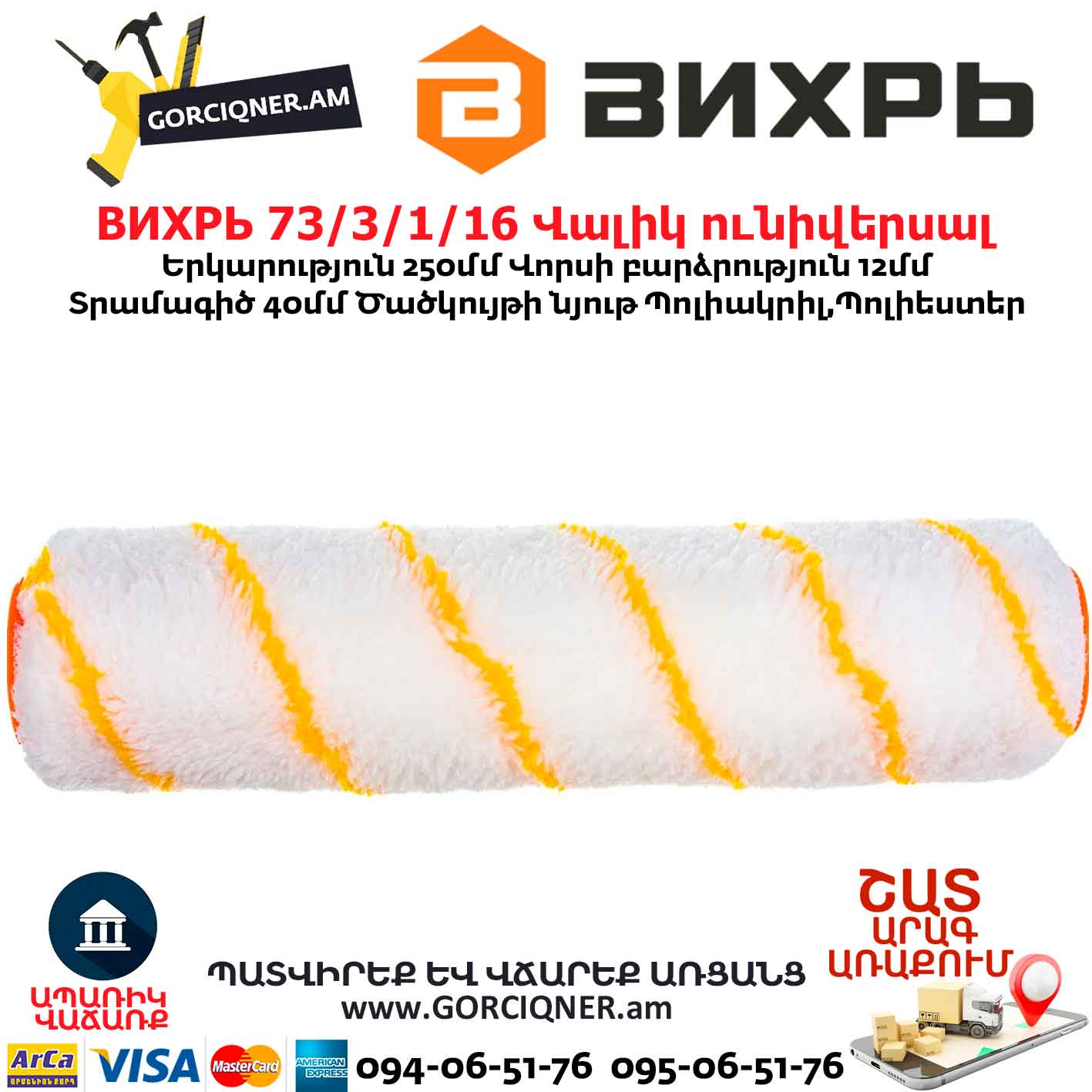Сменные валики Вихрь могут иметь различную длину ворса и ширину валика, что позволяет выбрать оптимальный вариант для конкретной задачи. Валик Вихрь 250/40/6 универсальный подходит для всех типов работ и лакокрасочных материалов. Ширина валика составляет 250 мм, что позволяет эффективно окрашивать большие площади. Длина ворса 12 мм подходит для работы по большинству поверхностей.