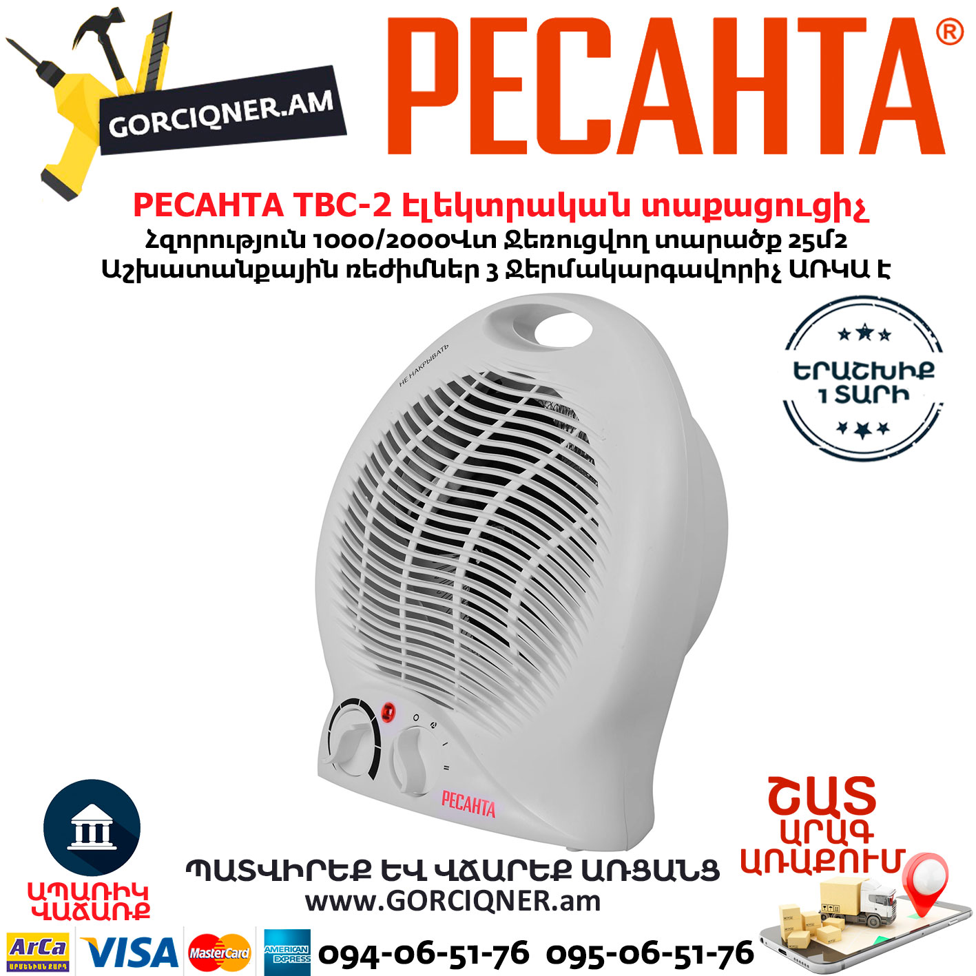 Тепловентилятор РЕСАНТА ТВС-2 – отопительный прибор, нагревающий поток воздуха, продуваемого через нагревательный элемент, при помощи встроенного вентилятора.