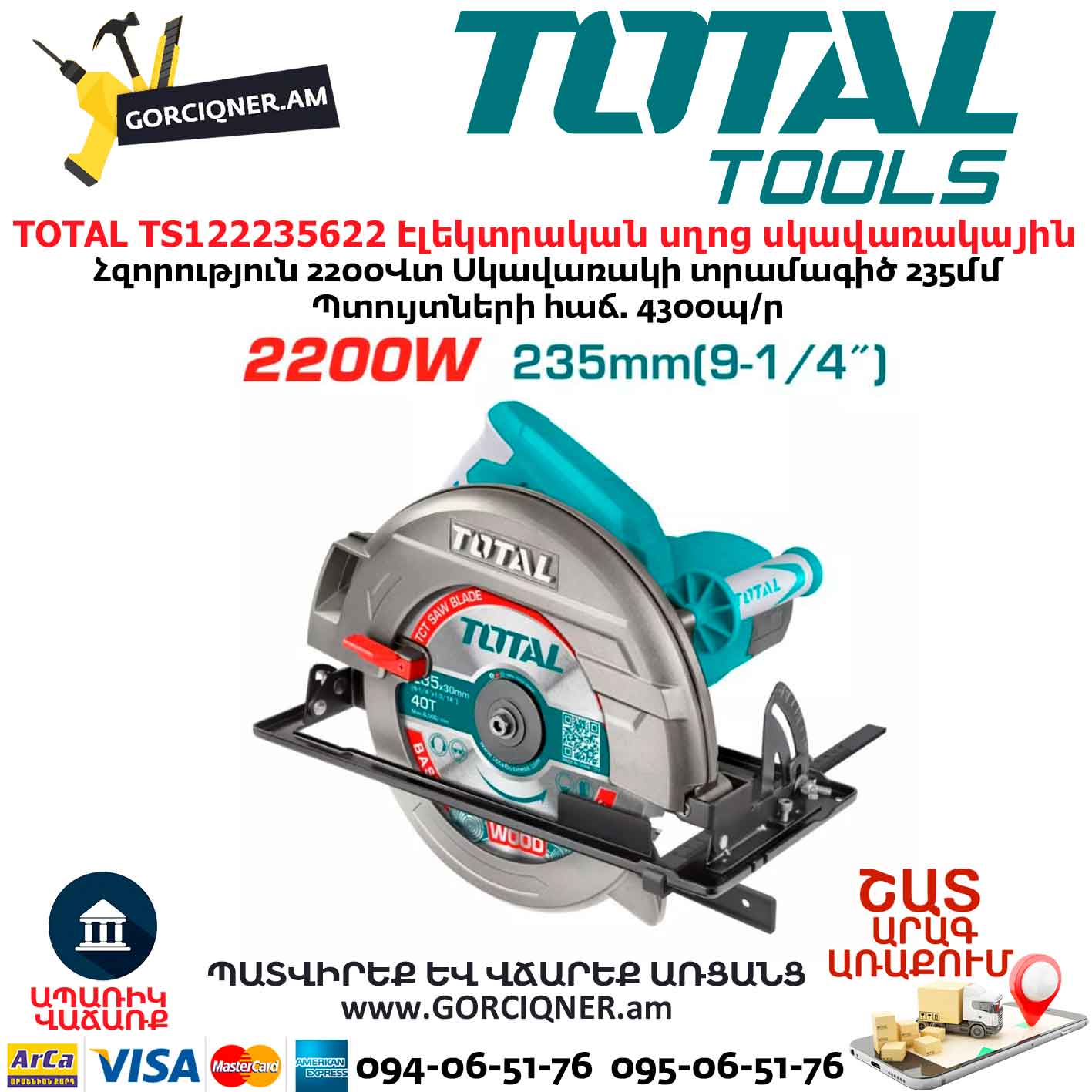 Циркулярная пила TOTAL TS122235622 235мм/2200Вт