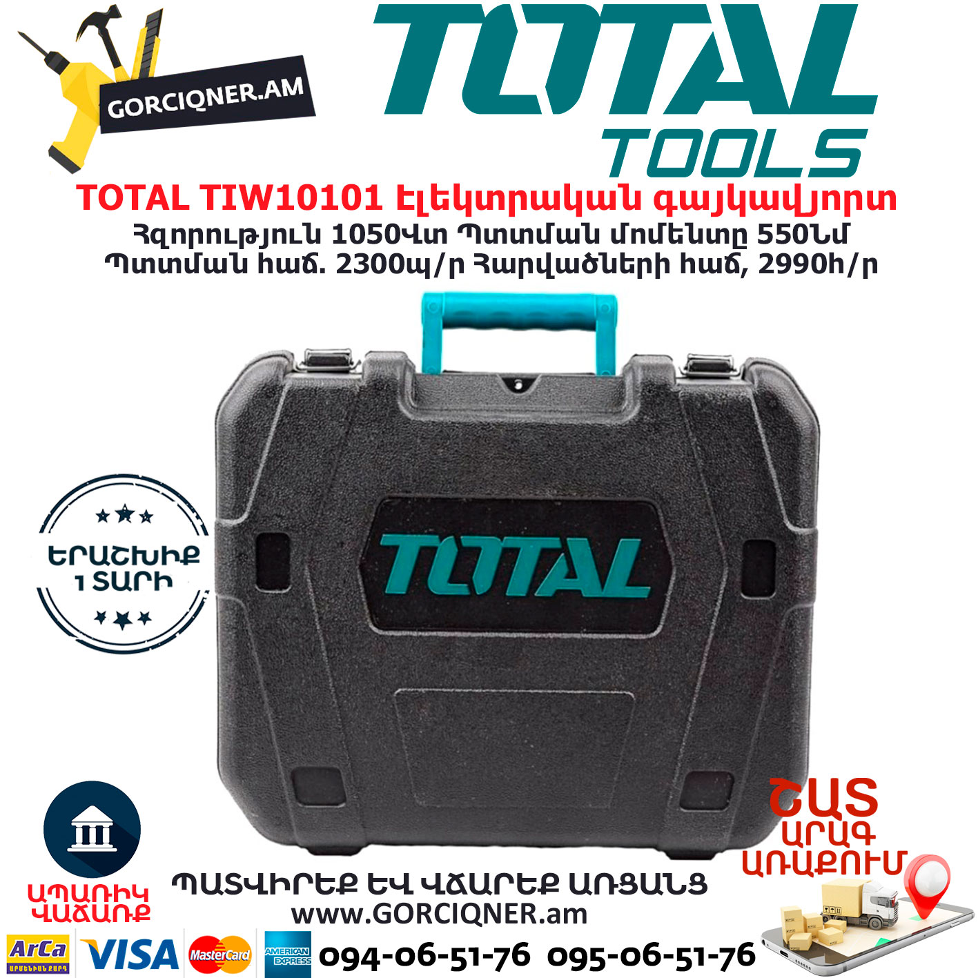 Электрический Гайковерт TOTAL TIW10101 1050Вт/550Нм1/2՛՛
