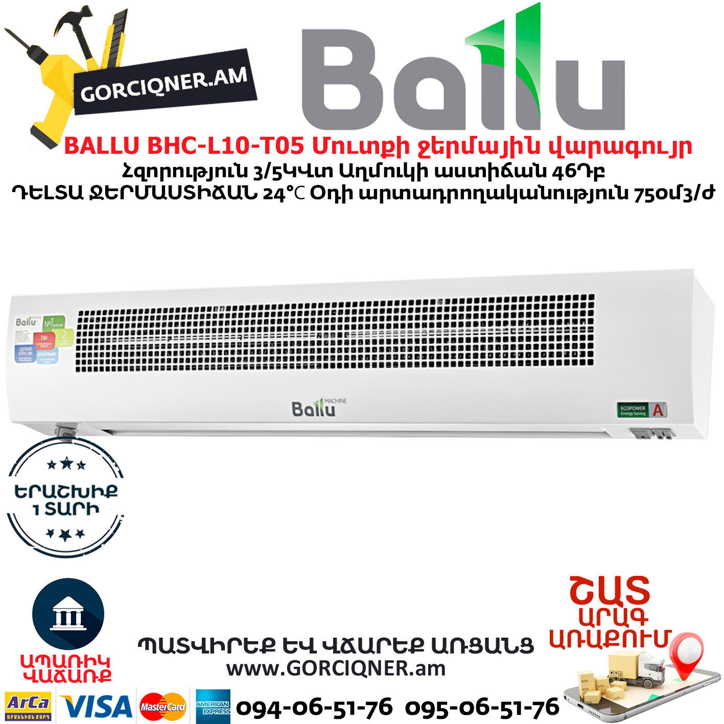 Электрическая тепловая завеса Ballu BHC-L10-T05 – компактная завеса мощностью 5 кВт и увеличенной производительностью 750 м³/ч применяется для защиты дверей высотой до 2,5 метров и шириной до 1 м.