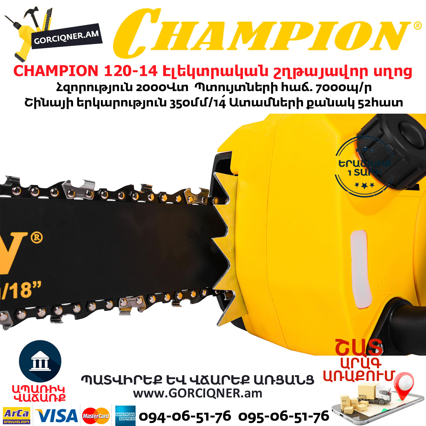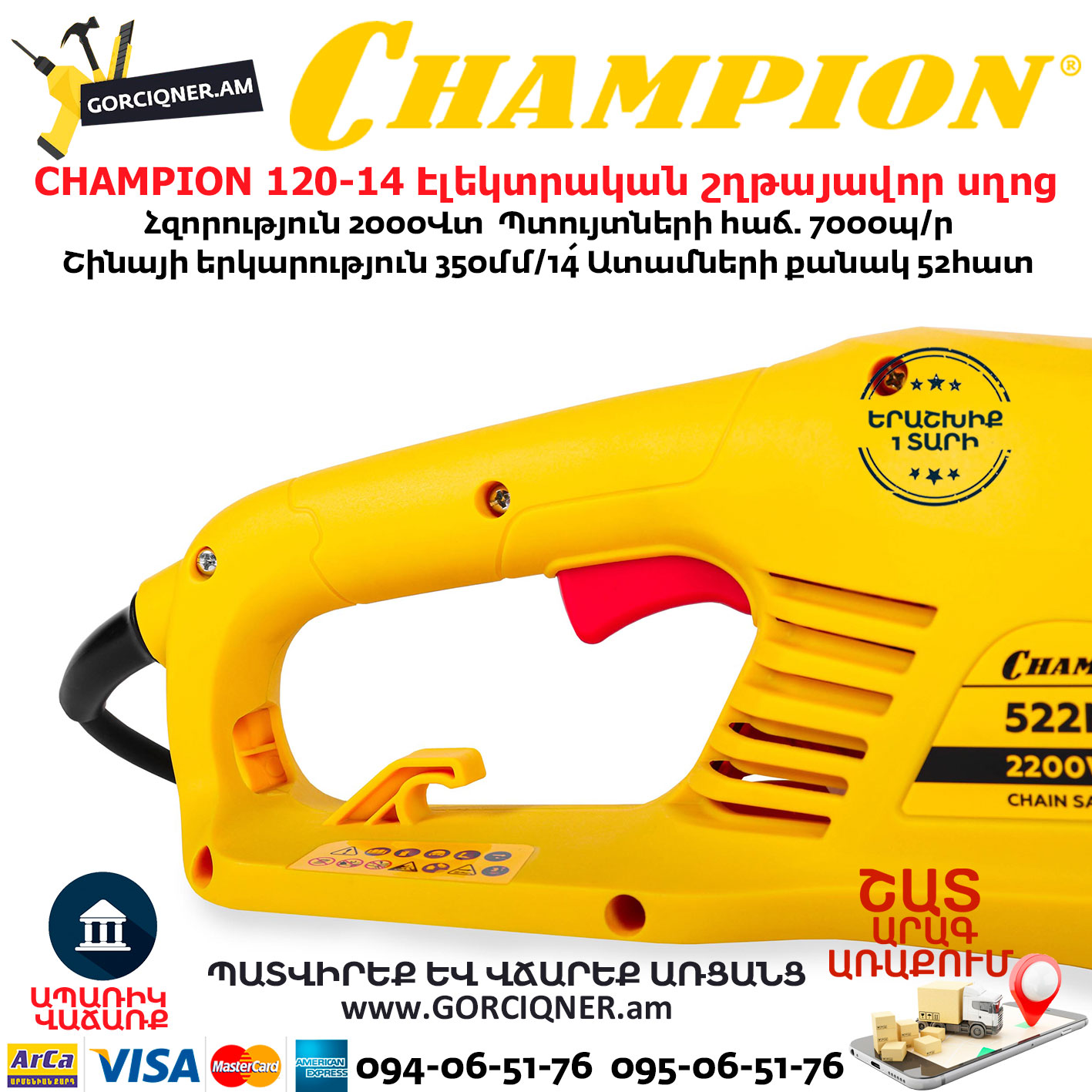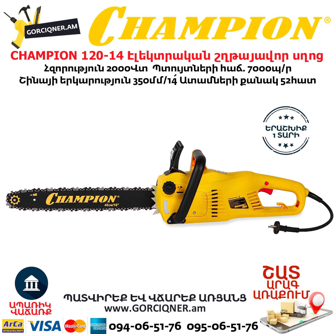 CHAMPION 522N-18 Электрическая цепная пила 450мм/2200Вт
