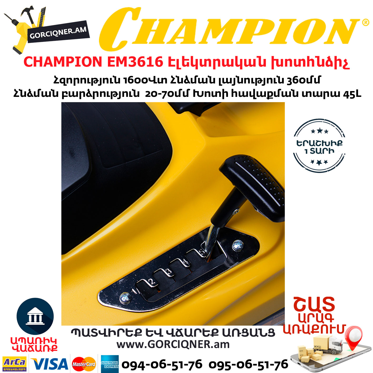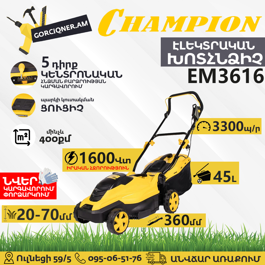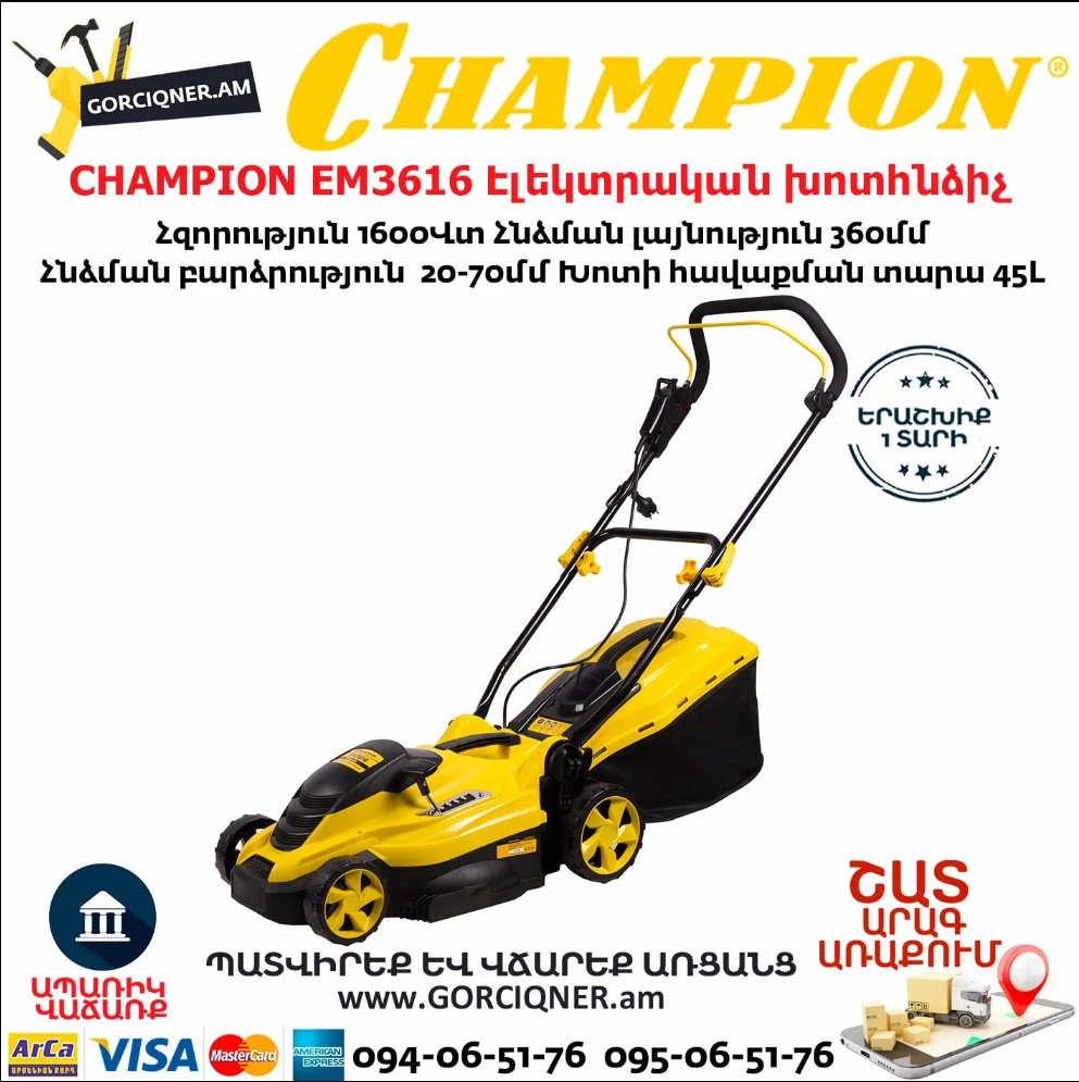 CHAMPION EM3616 Электрическая газонокосилка 360мм/1600Вт