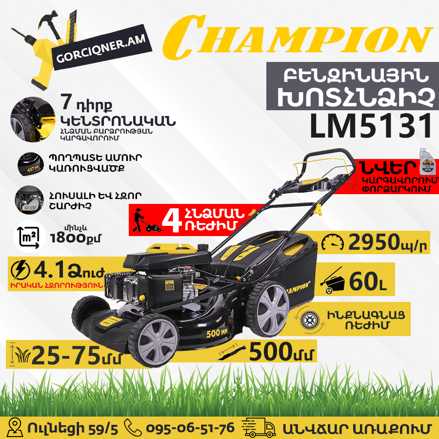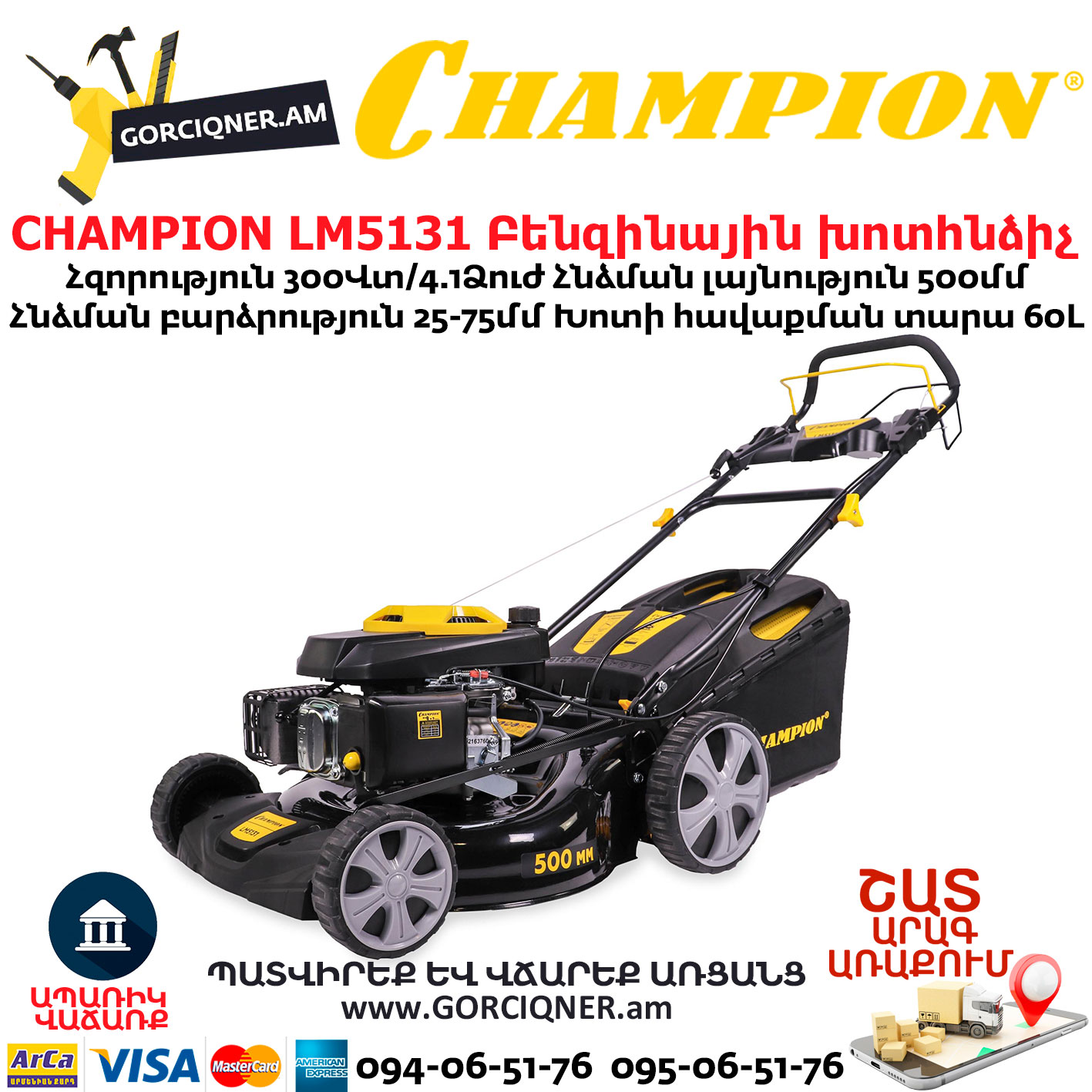 Задние колеса газонокосилки Champion LM5131 больше передних, что позволяет без потери качества работы использовать её при скашивании травы на небольших склонах. |