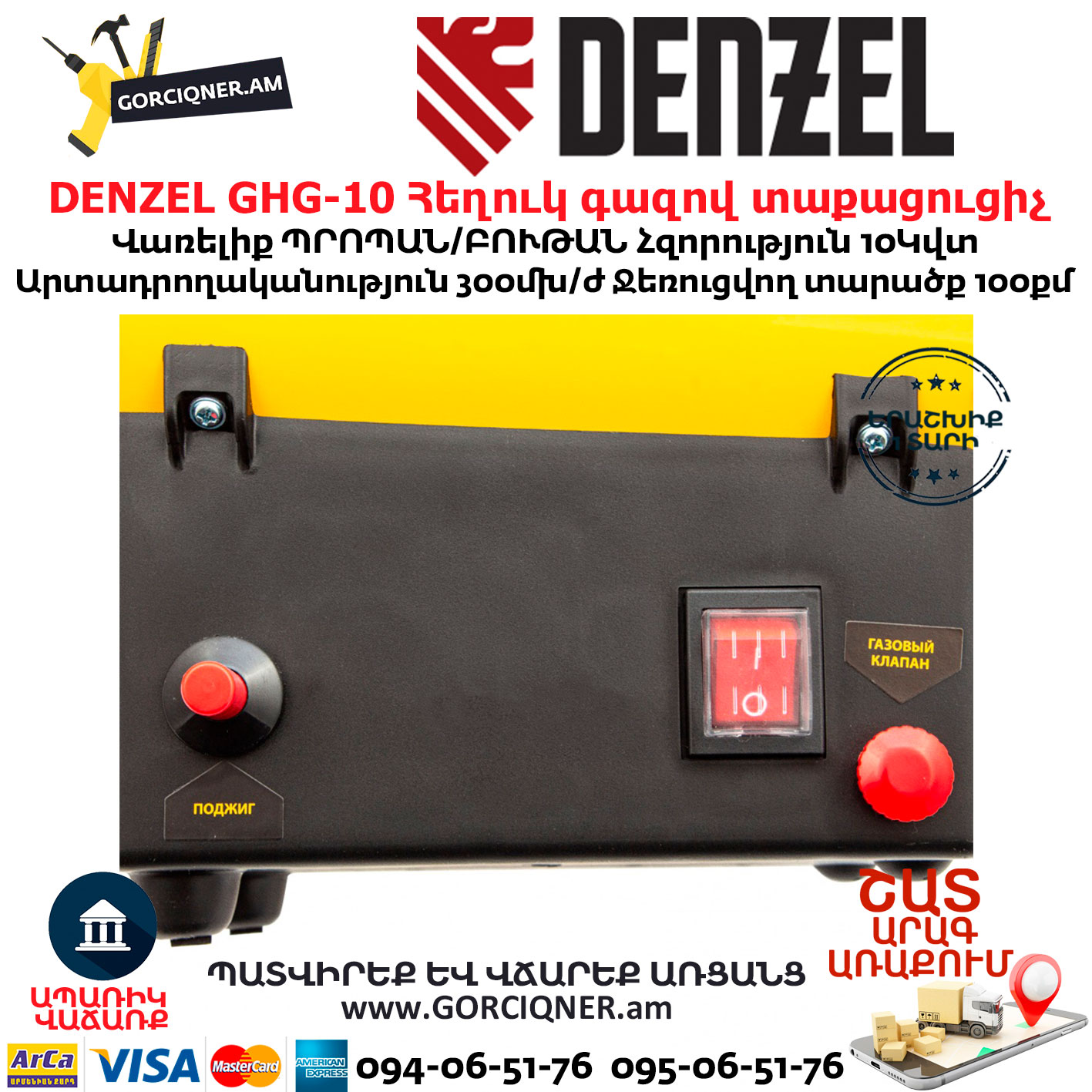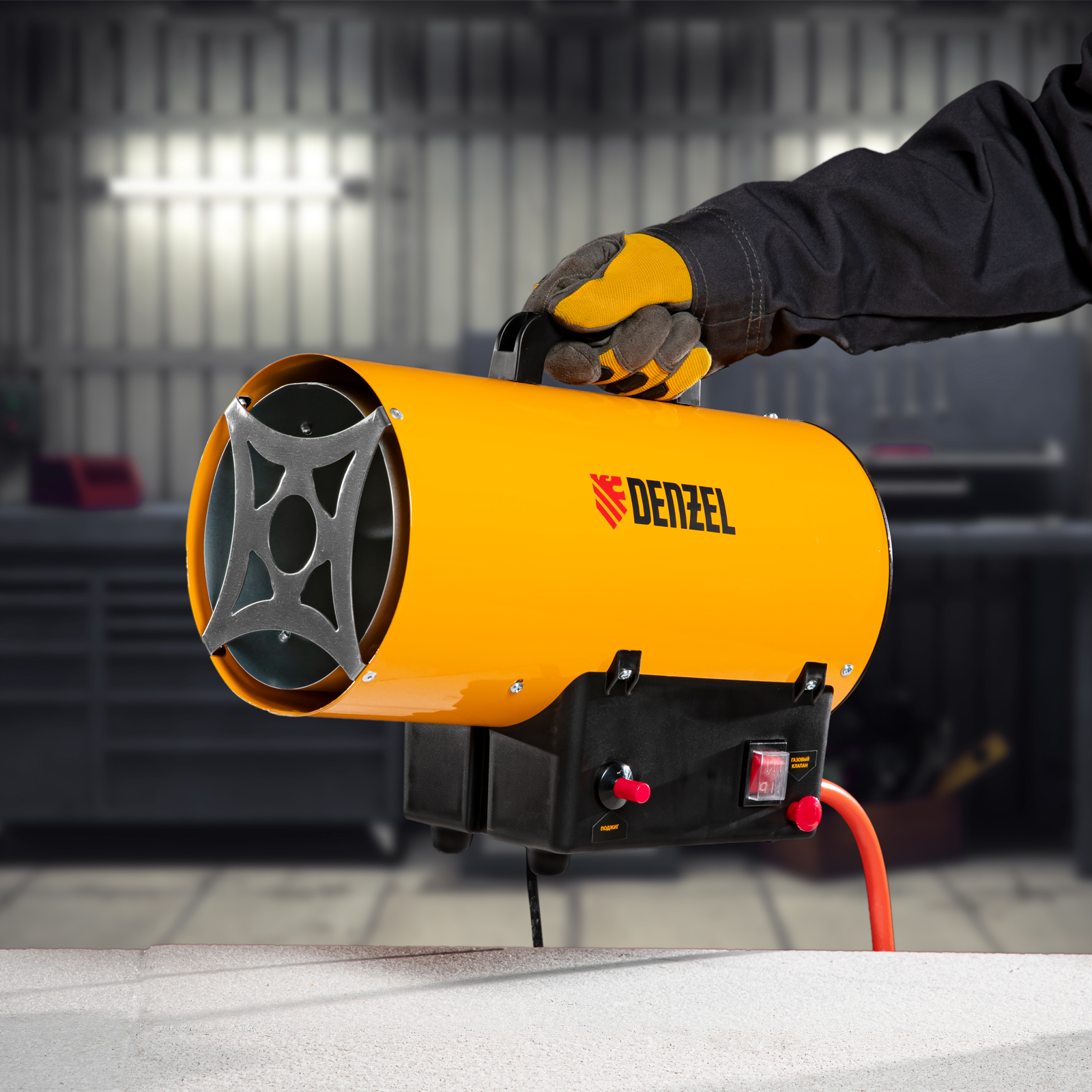 Газовая тепловая пушка Denzel GHG-10 96476 мощностью 10 кВт работает на смеси пропан-бутан и выдает тепловой поток со скоростью 300 куб. м/ч. Используется для обогрева складов, цехов, гаражей, теплиц и других нежилых помещений площадью до 100 кв. м. Будет полезна на строительных площадках и в производственных помещениях, а также для монтажа натяжных потолков.