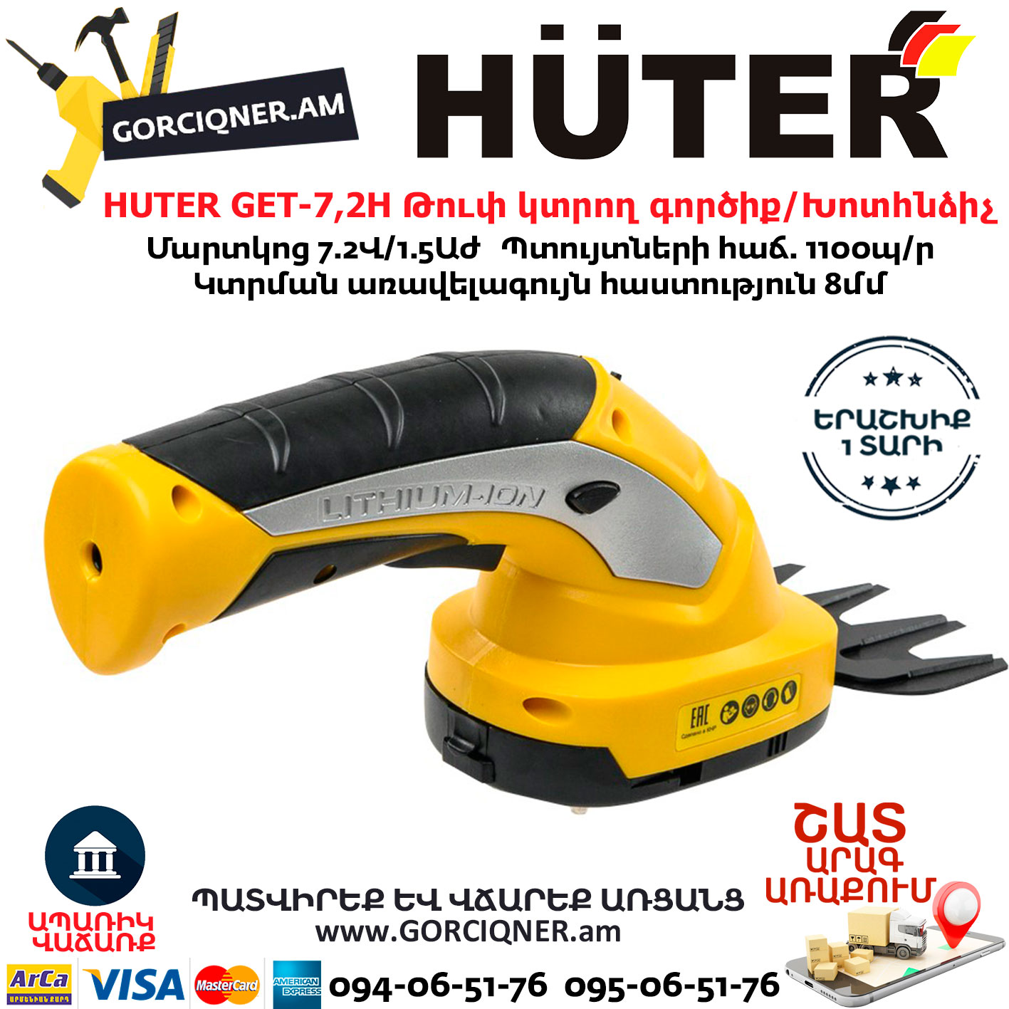 HUTER GET-7,2H Аккумуляторный электрический триммер-кусторез 7.2В