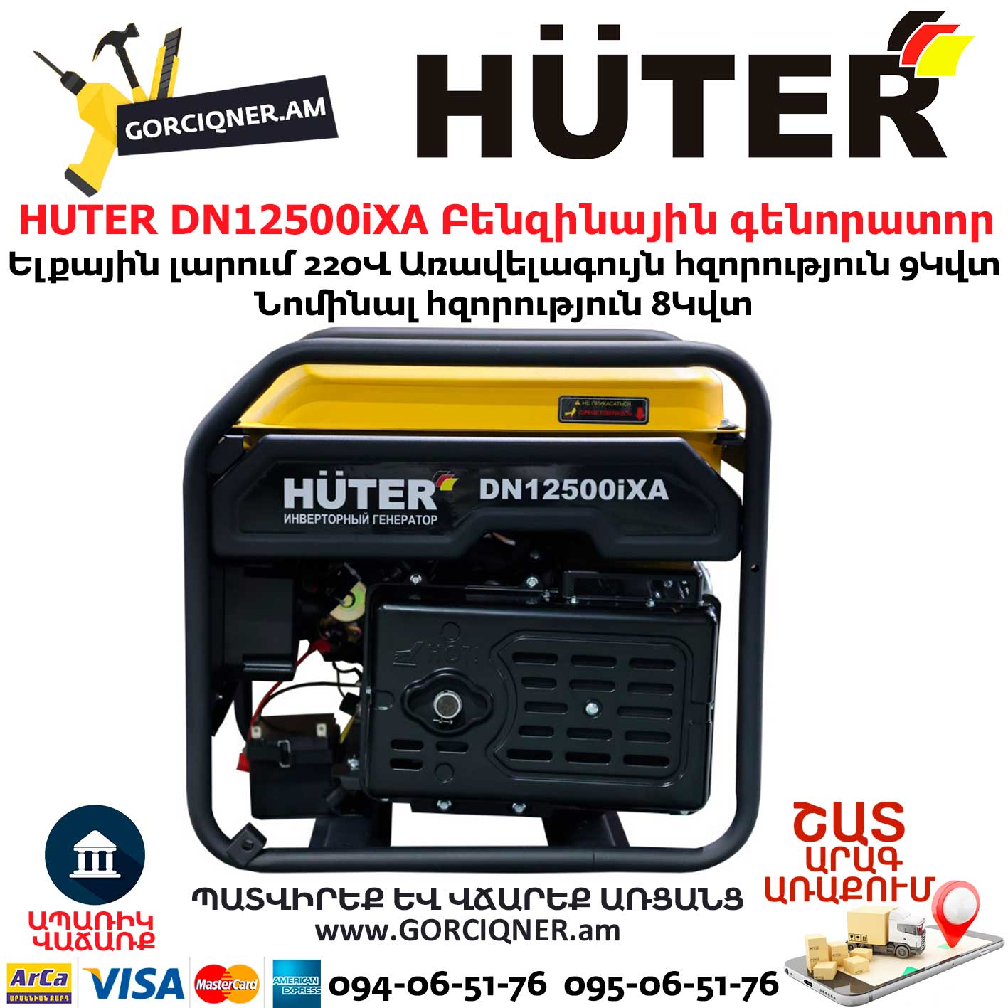 В местах, где нет центрального электроснабжения или имеют место частые его перебои, на помощь придёт электрогенератор Huter DN12500iXA. Это компактный агрегат, в котором источником энергии используется 4-тактный карбюраторный двигатель, работающий на неэтилированном бензине АИ-92. Ёмкость топливного бака составляет 25 л. Тип генератора – инверторный, а это значит, что он выдаёт ток с крайне малой погрешностью, который специалисты называют «чистым синусом» и используют для питания чувствительного электронного оборудования, такого как, например, ноутбуки, смартфоны, различная оргтехника.