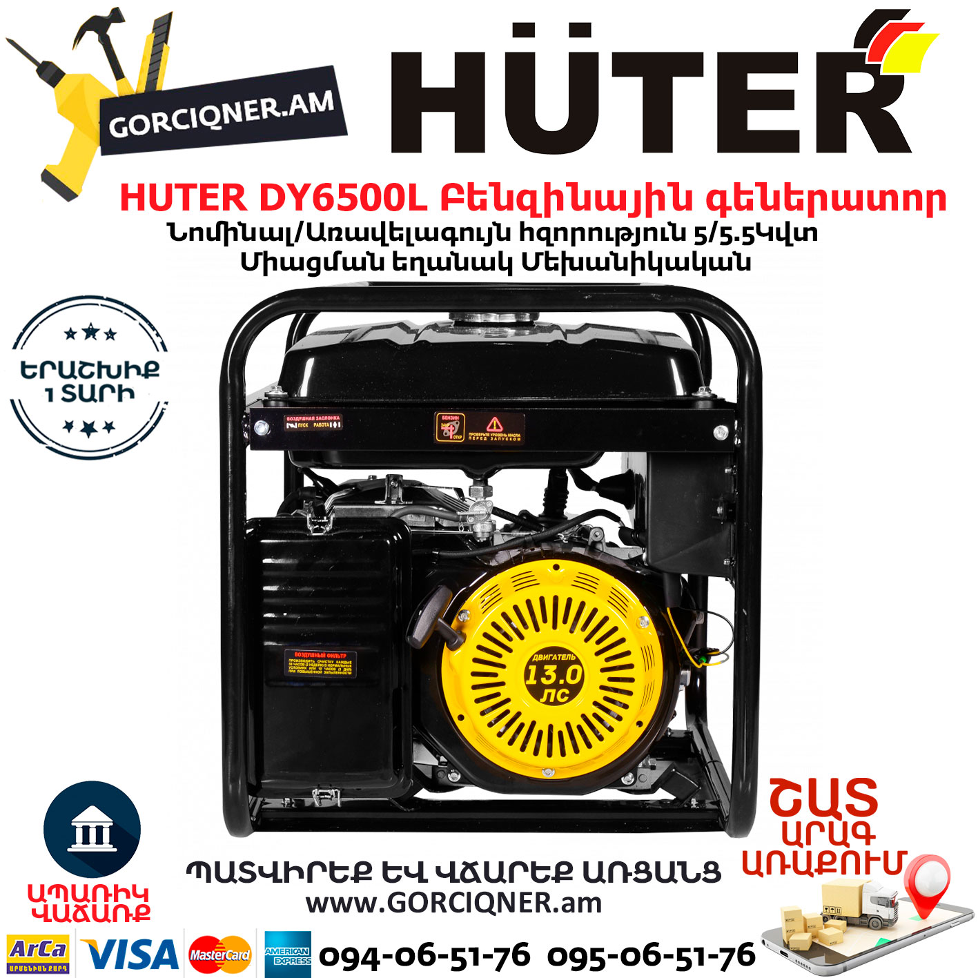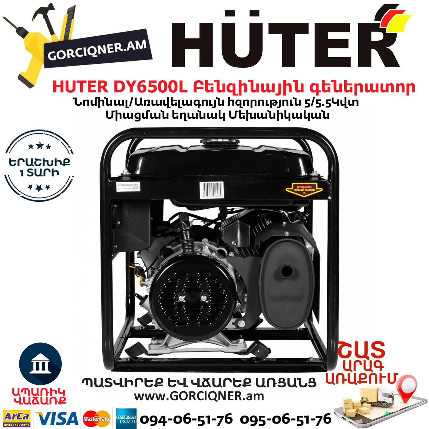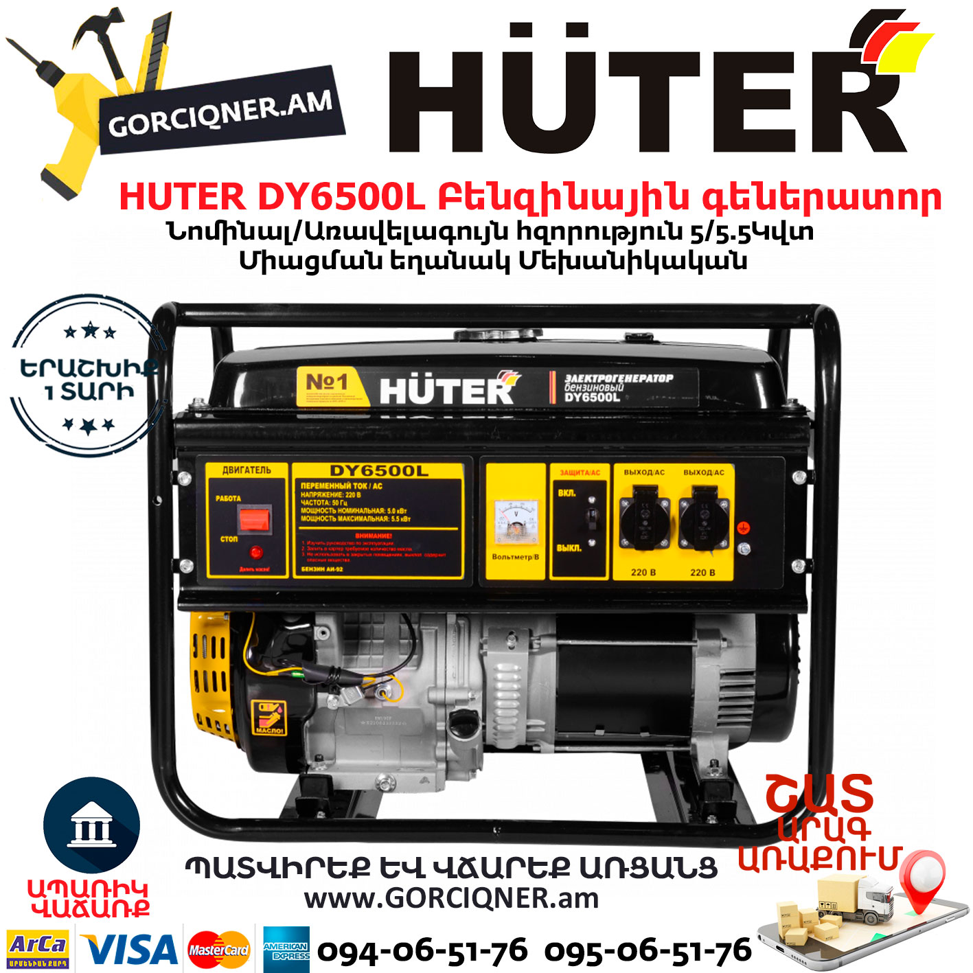 HUTER DY6500L Портативный бензогенератор 5500Вт