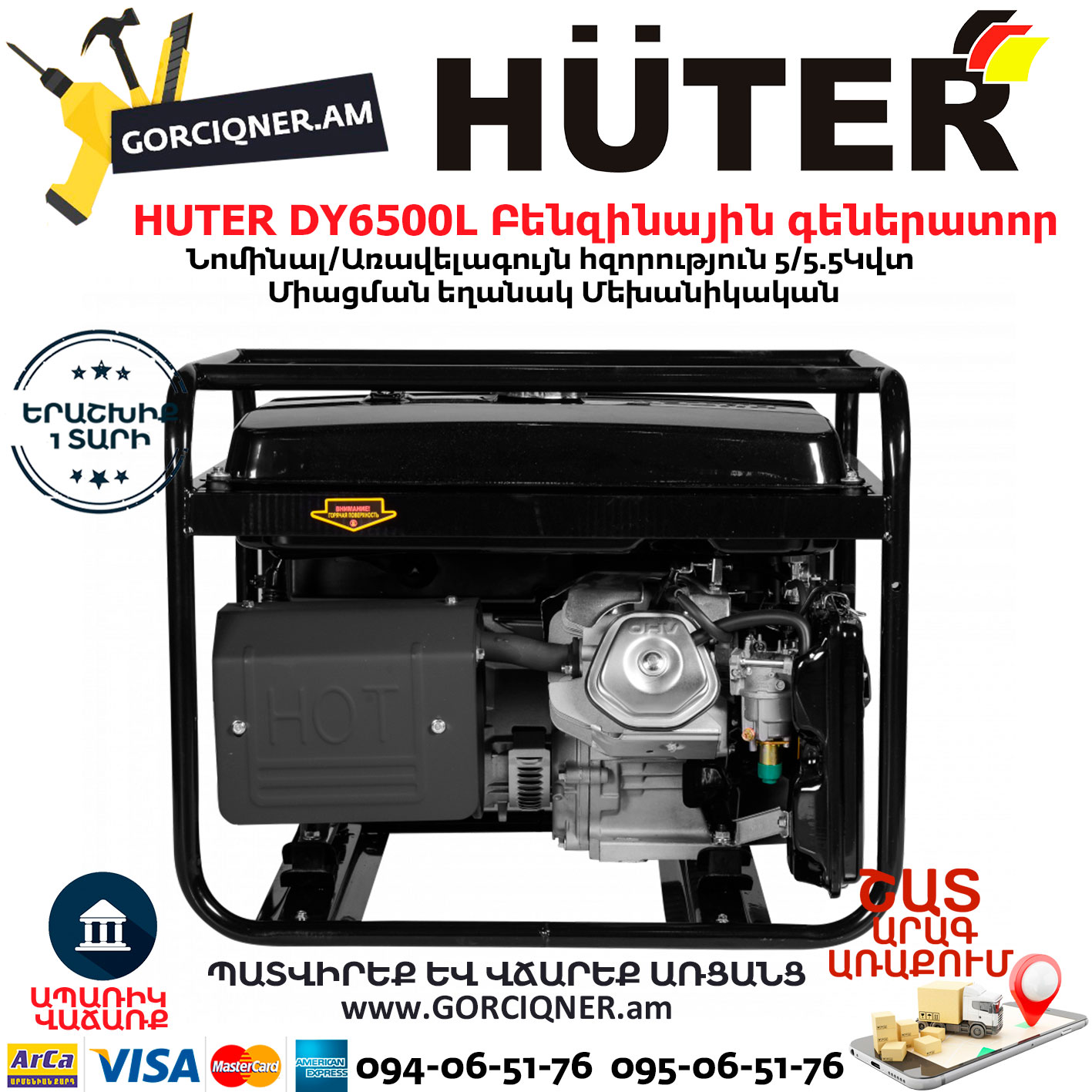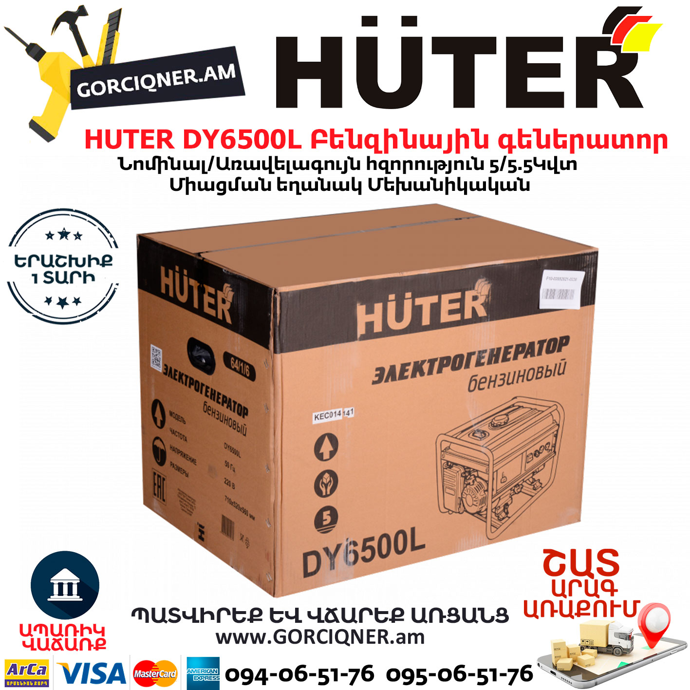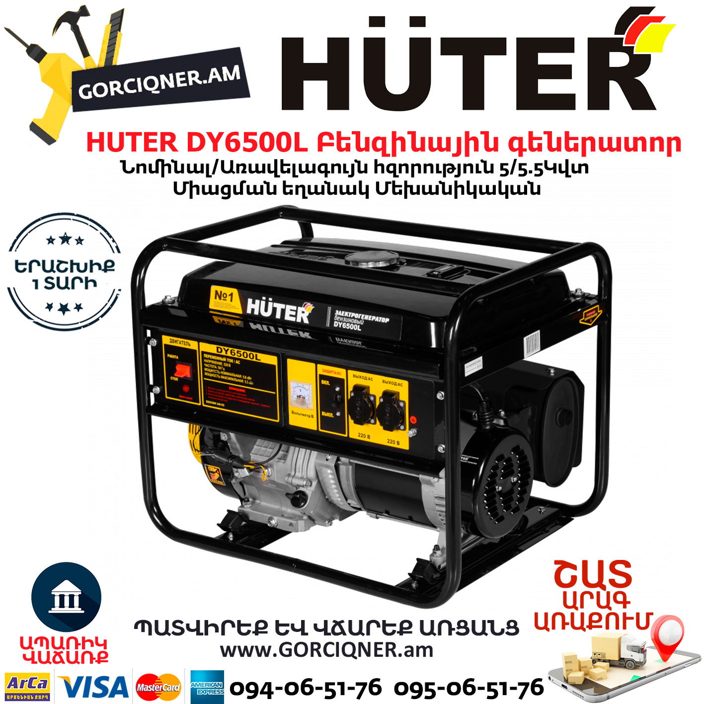 HUTER DY6500L Портативный бензогенератор 5500Вт