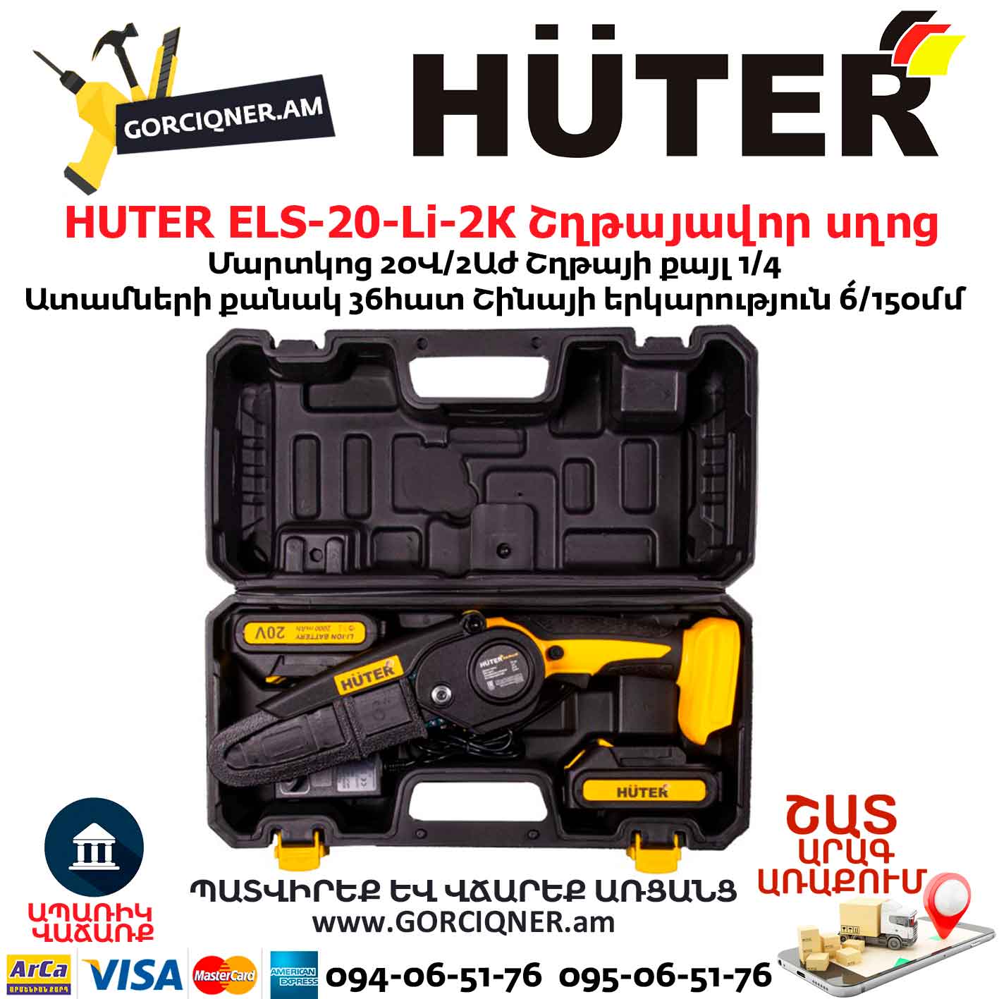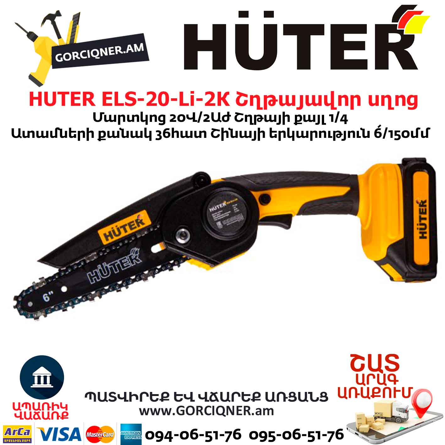 HUTER ELS-20-Li-2К Аккумуляторная электропила 20В/2А*ч