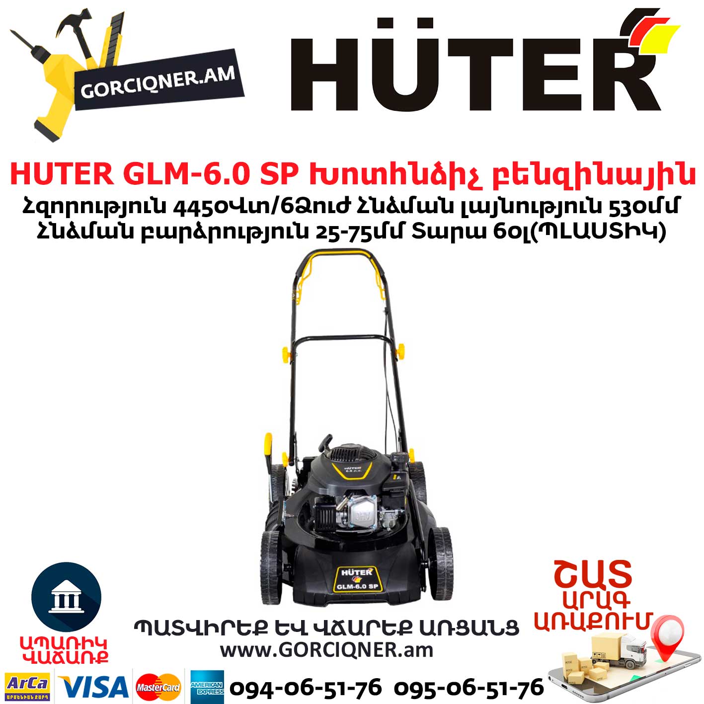 Газонокосилка HUTER GLM-6.0 SP состоит из бензинового двигателя мощностью 6 л.с., металлического корпуса, режущего ножа и колес. Оснащена пластиковым травосборником объемом 65 л. для хранения скошенной травы. Доступен боковой выброс травы и мульчирование. Косилка работает на 92 бензине, объем топливного бака – 1,2 л.