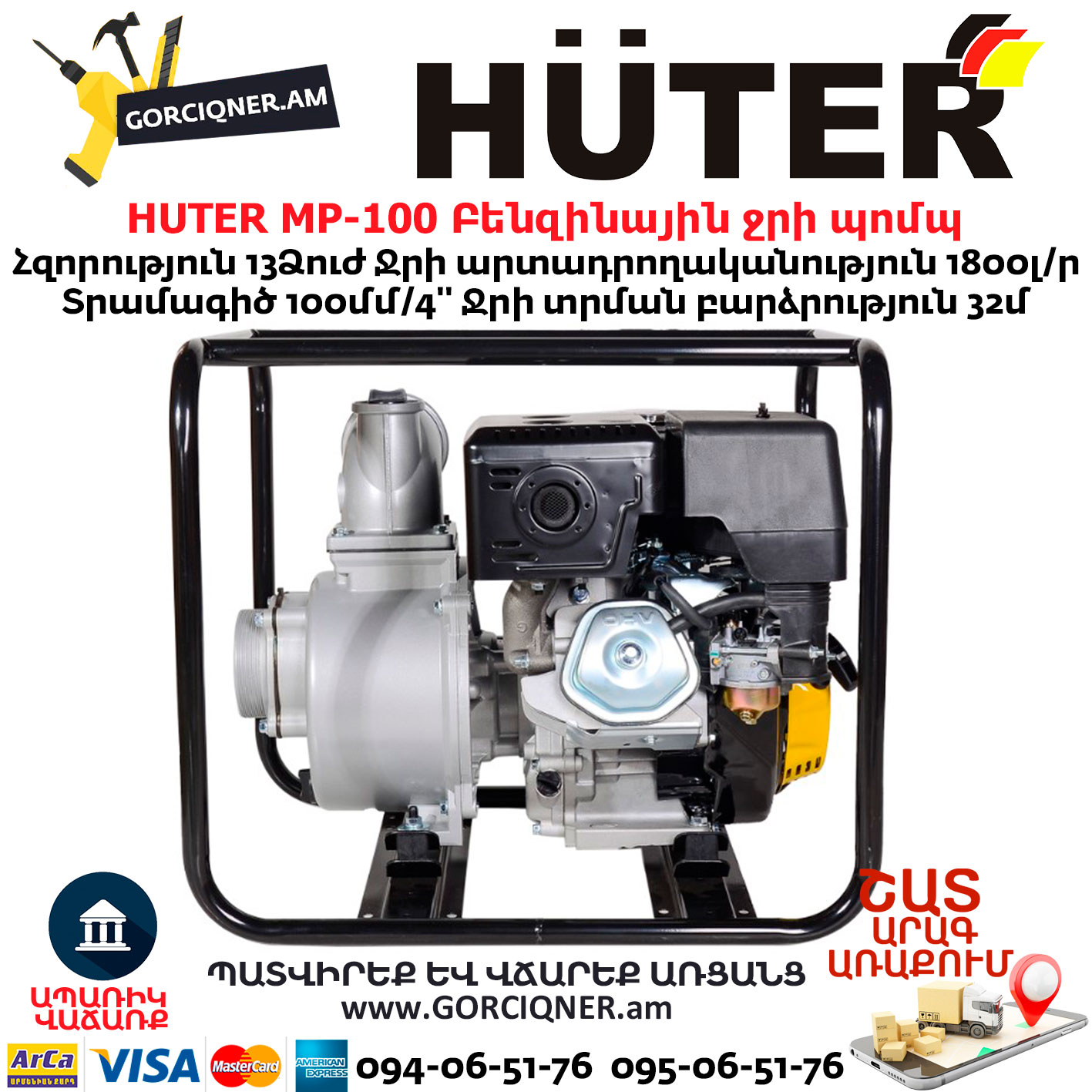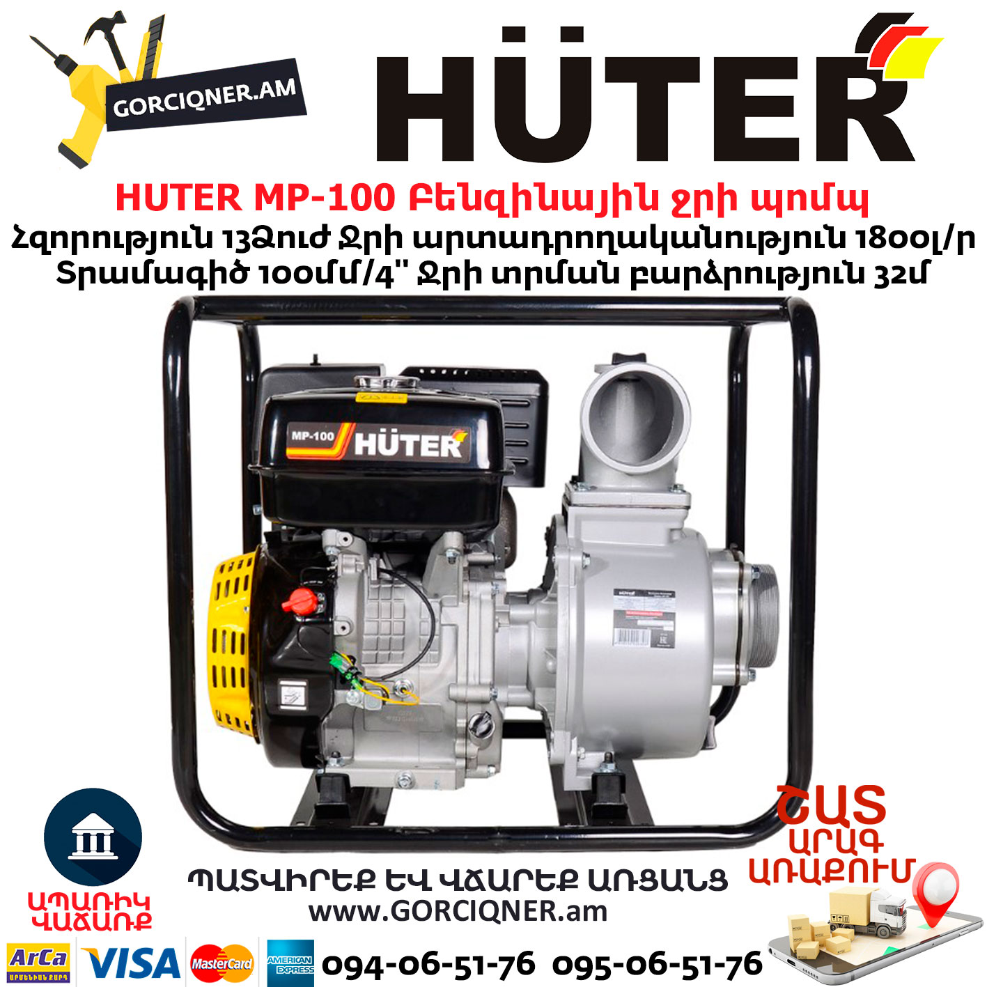 Модель Huter MP-100 используется в частных и фермерских хозяйствах для откачки воды из бассейнов, колодцев, полива огорода, тушения огня. Модель является самой мощной в линейке и способна перекачивать до 1800 л чистой воды в минуту.