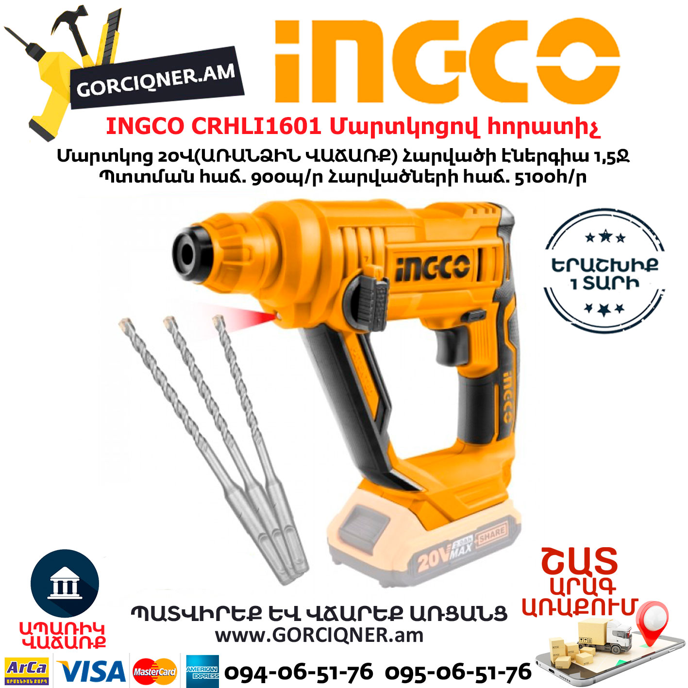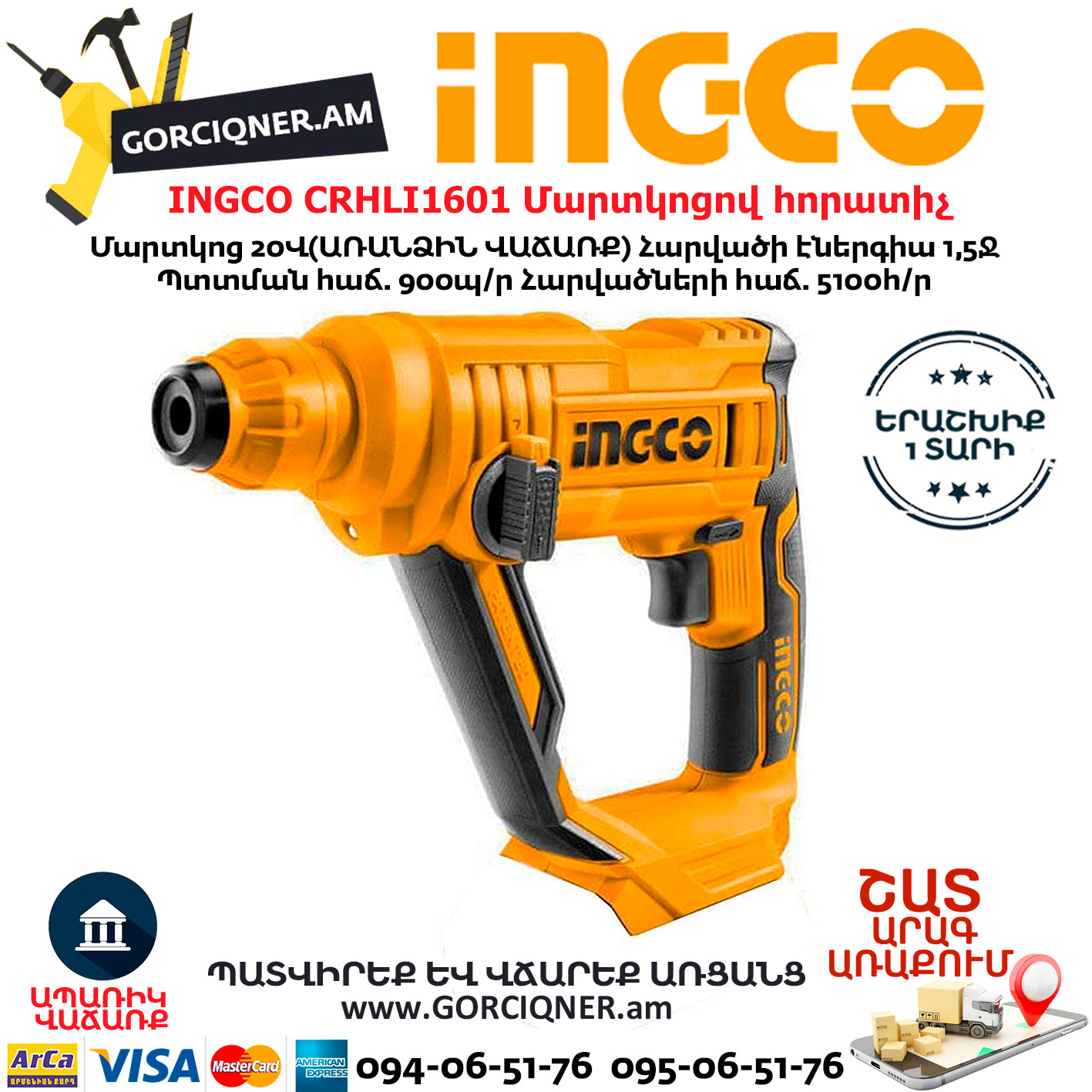 INGCO CRHLI1601 Аккумуляторный перфоратор 20В