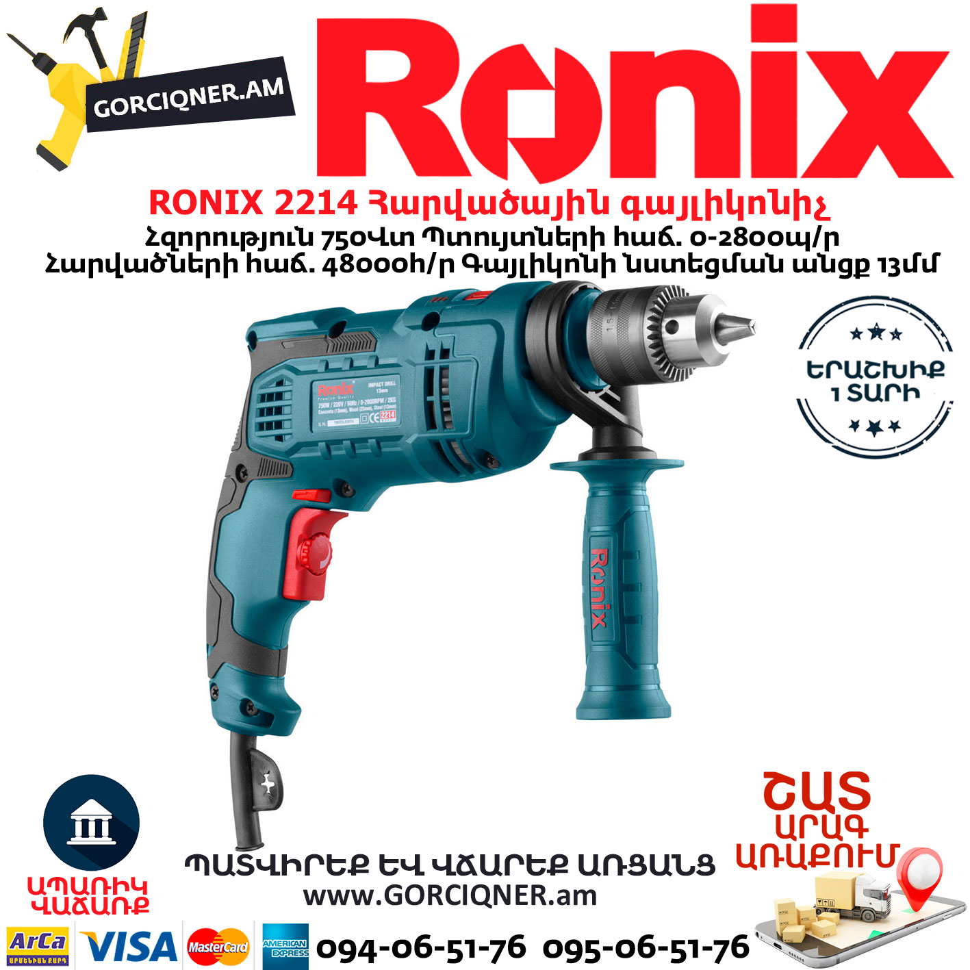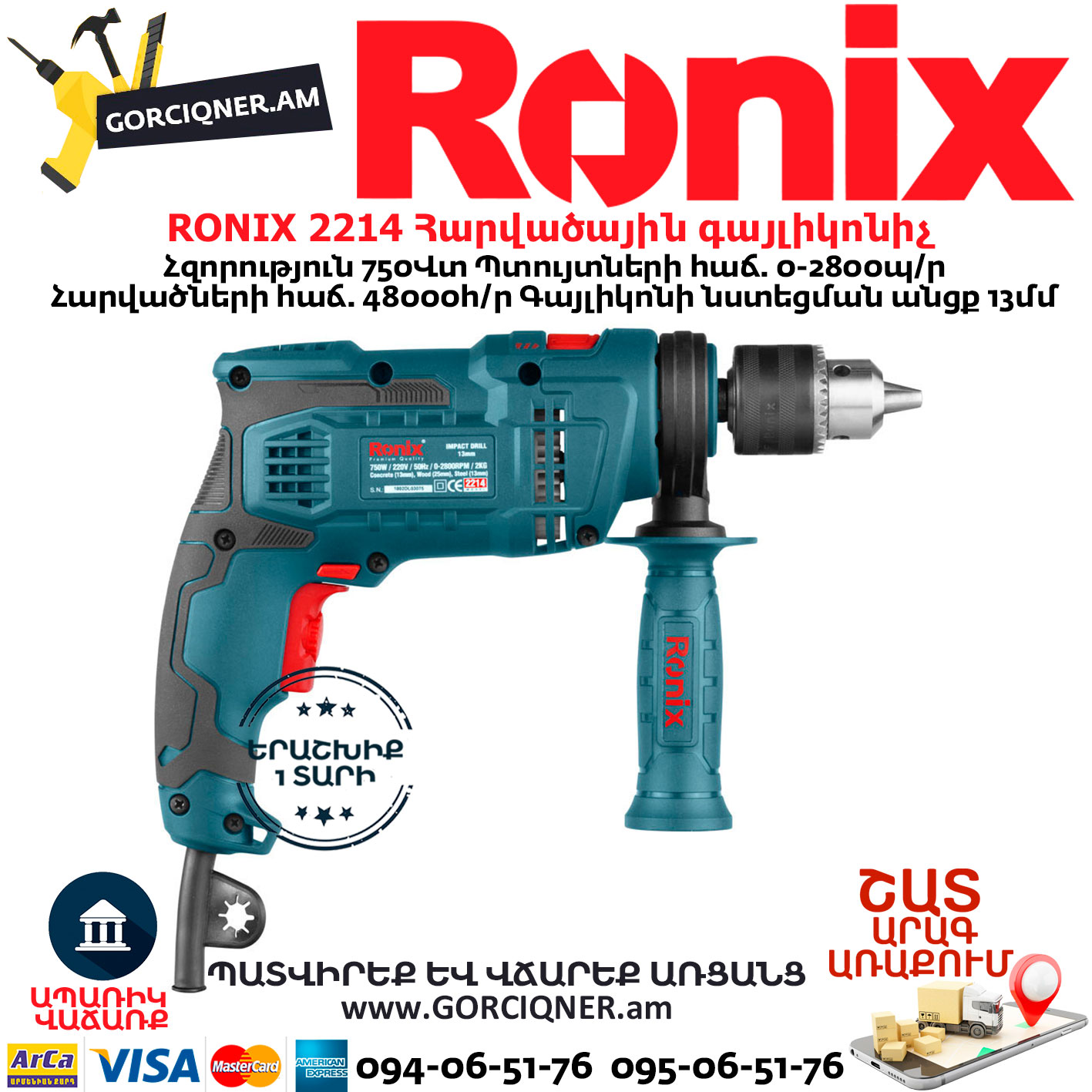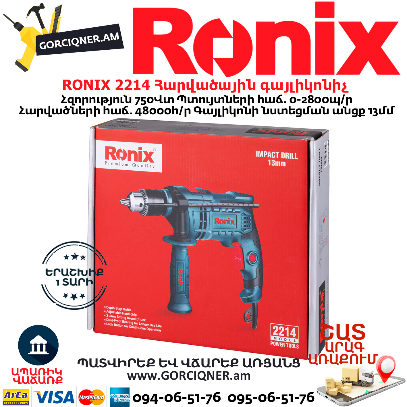 RONIX 2214 Ударная дрель 750 Вт