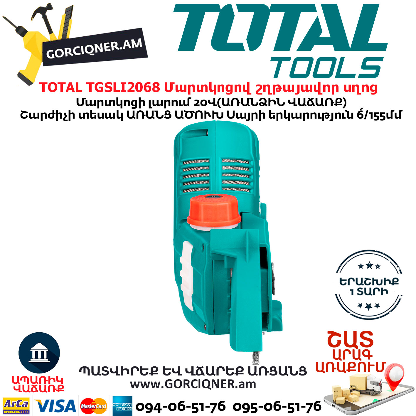 TOTAL TGSLI2068 Аккумуляторная цепная пила 20А
